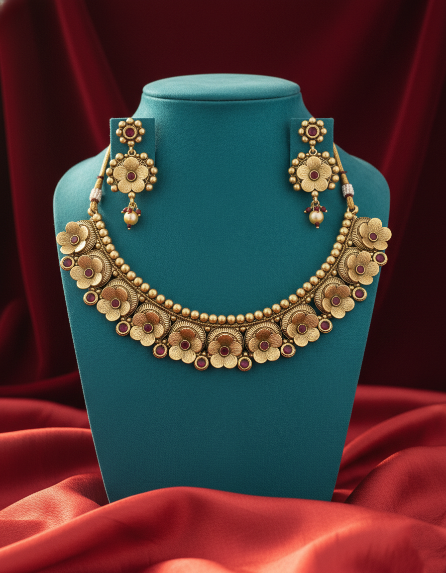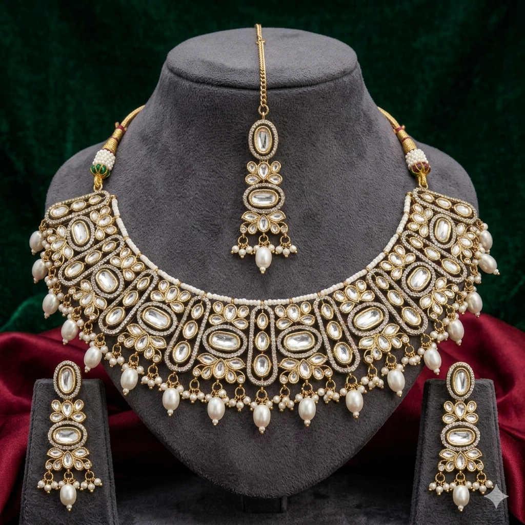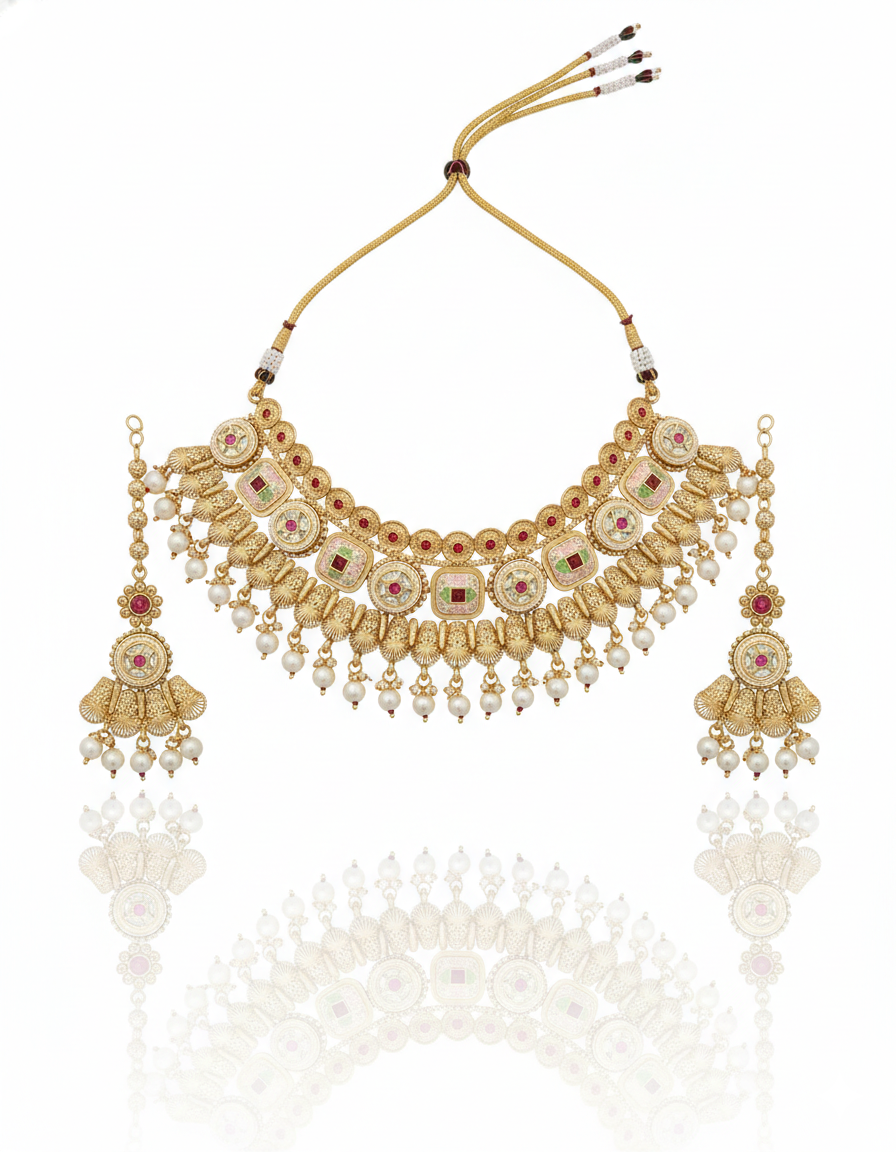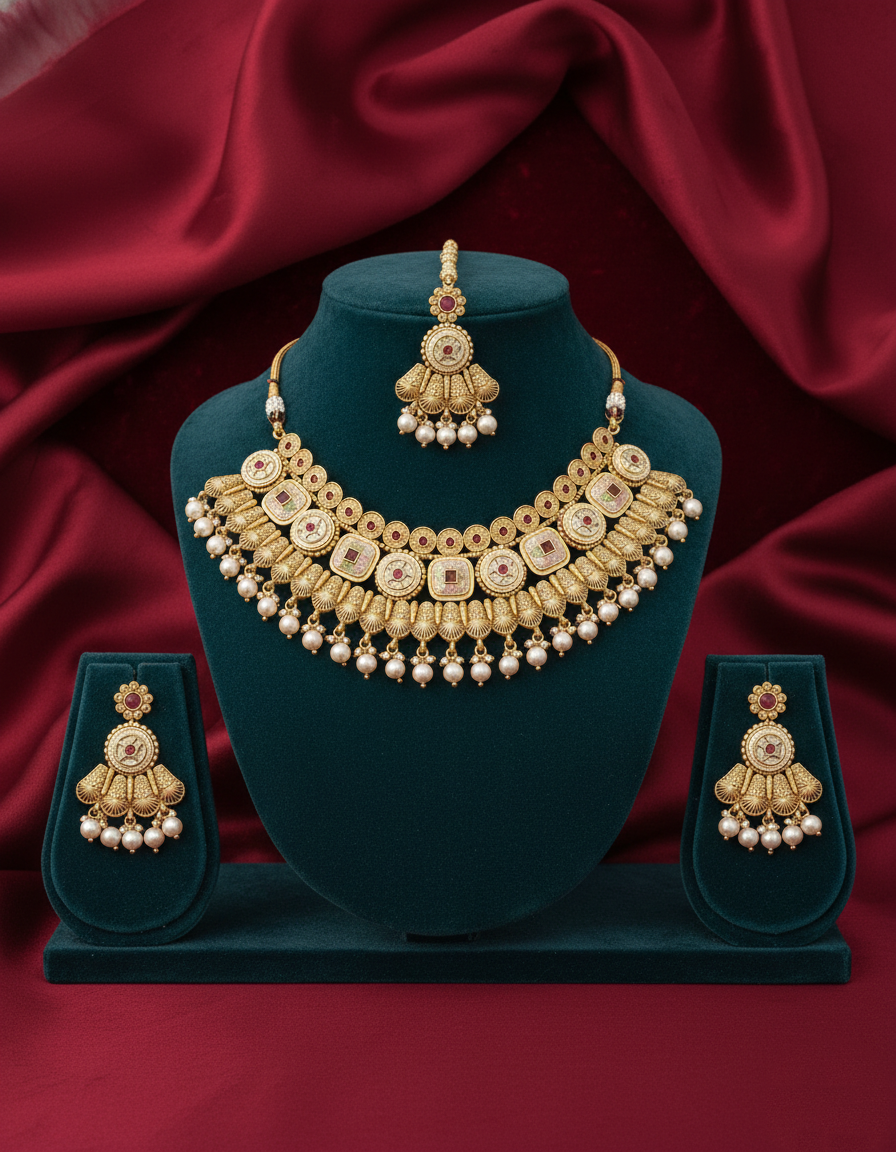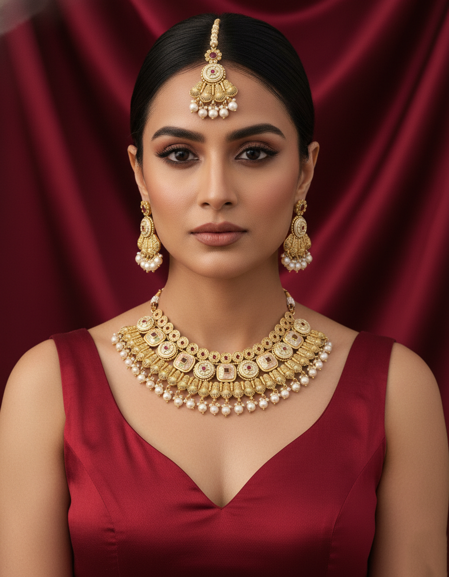 Embrace royal elegance with this antique gold bridal necklace set, intricately designed with traditional Kundan-style detailing and soft ruby-toned accents. The layered motifs are beautifully finished with delicate pearl drops, adding graceful movement and charm. This complete set includes a statement necklace, matching earrings, and a coordinating maang tikka, making it perfect for weddings, festive occasions, and cultural celebrations.