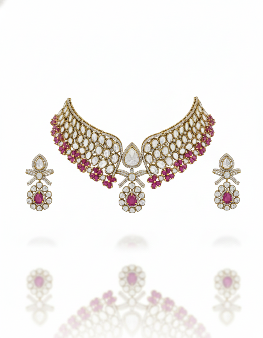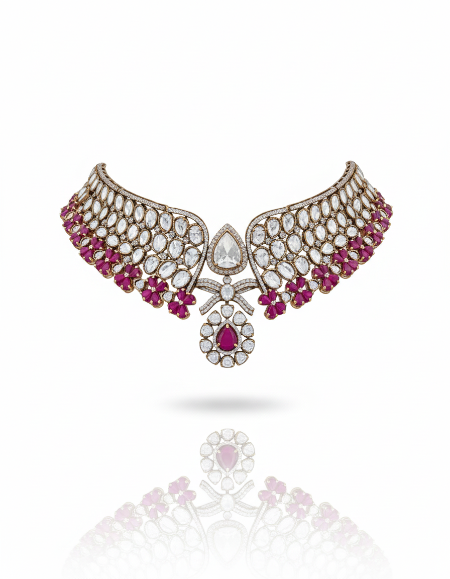 The Aarohi Wings of Grace Set is a refined expression of elegance and modern heritage design. Inspired by the gentle form of wings, this stunning necklace features a lattice of brilliant diamond-cut stones highlighted with soft ruby accents that add warmth and depth. The central teardrop motif creates a striking yet balanced focal point, while the matching earrings mirror the same delicate craftsmanship for a harmonious look. Lightweight yet luxurious, this set is perfect for weddings, receptions, and elegant soirées. Its airy silhouette and radiant sparkle make it ideal for those who appreciate understated luxury with a contemporary royal touch.
