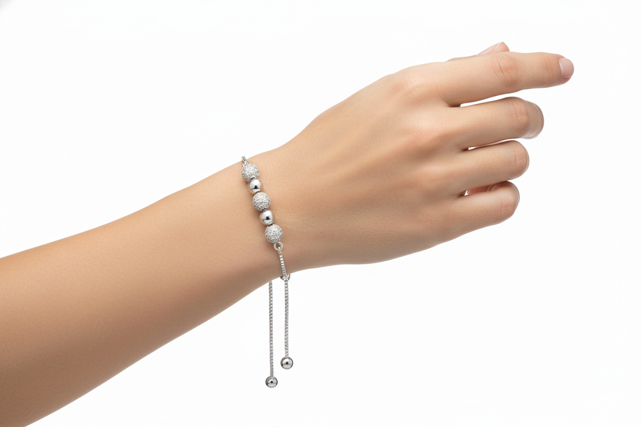 A modern classic designed for effortless elegance, this adjustable bolo bracelet features a rhythmic sequence of hand-polished beads and shimmering pavé-set spheres. Strung on a delicate box chain, this white gold-tone piece offers a customizable fit and a brilliant, multifaceted sparkle.