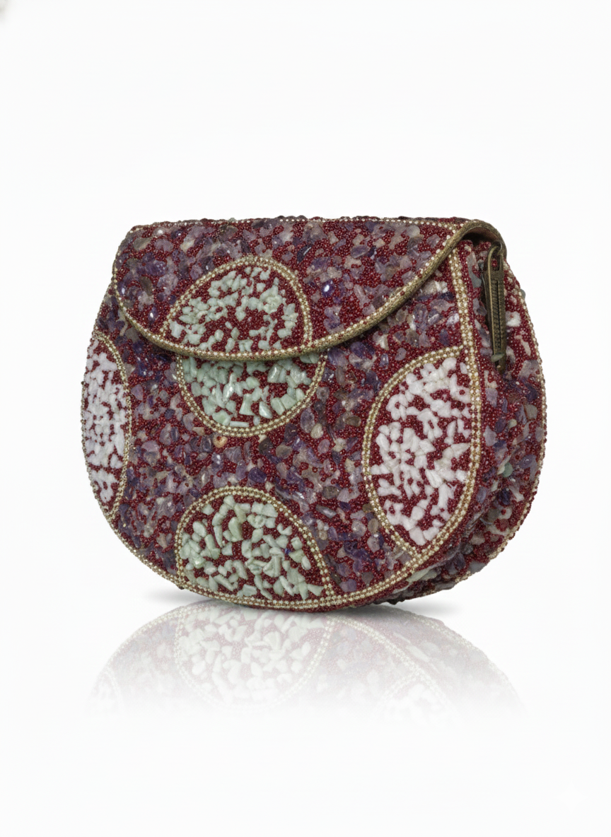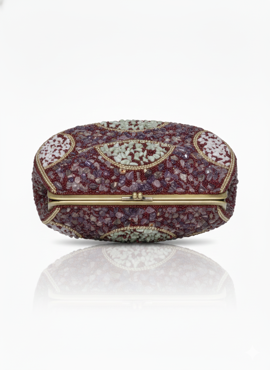 This artisanal semi-circle clutch is a stunning display of organic texture and vibrant color. The bag is meticulously handcrafted using a mosaic of crushed natural stones; deep amethyst-purple chips form the primary backdrop, while mint-green and crisp white stones are inlaid to create striking circular motifs. Each section is outlined with delicate metallic gold beadwork, adding a refined finish to the rugged beauty of the minerals. Featuring a slim gold-tone chain strap and a magnetic flap closure, this unique accessory brings a touch of “boho-luxury” to evening wear or festive occasions.