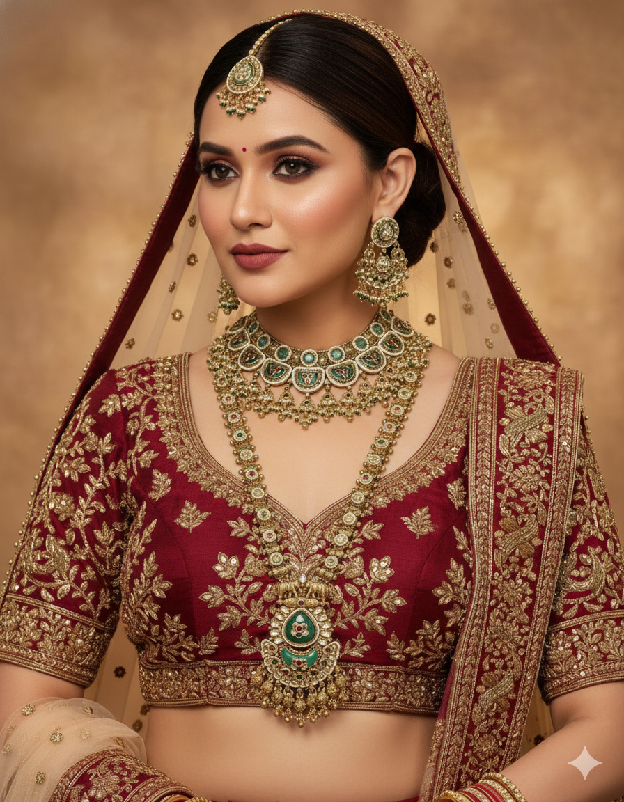 • Complete Bridal Suite: This comprehensive set includes a broad choker, a long statement necklace, matching heavy-drop earrings, and a traditional Maang Tikka, ensuring a perfectly coordinated aesthetic.