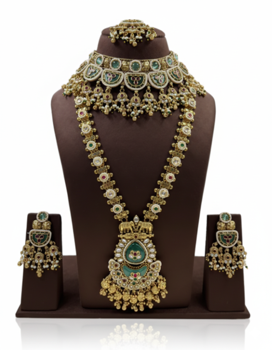 Embrace the timeless beauty of Indian royalty with this majestic bridal jewelry set. This ensemble features a rich antique gold finish, combining a heavy-work choker with a long “Haar” necklace adorned with intricate Meenakari work, emerald green stones, and traditional elephant motifs. Complete with matching chandelier earrings and a Maang Tikka, it is the ultimate choice for a classic bridal look.