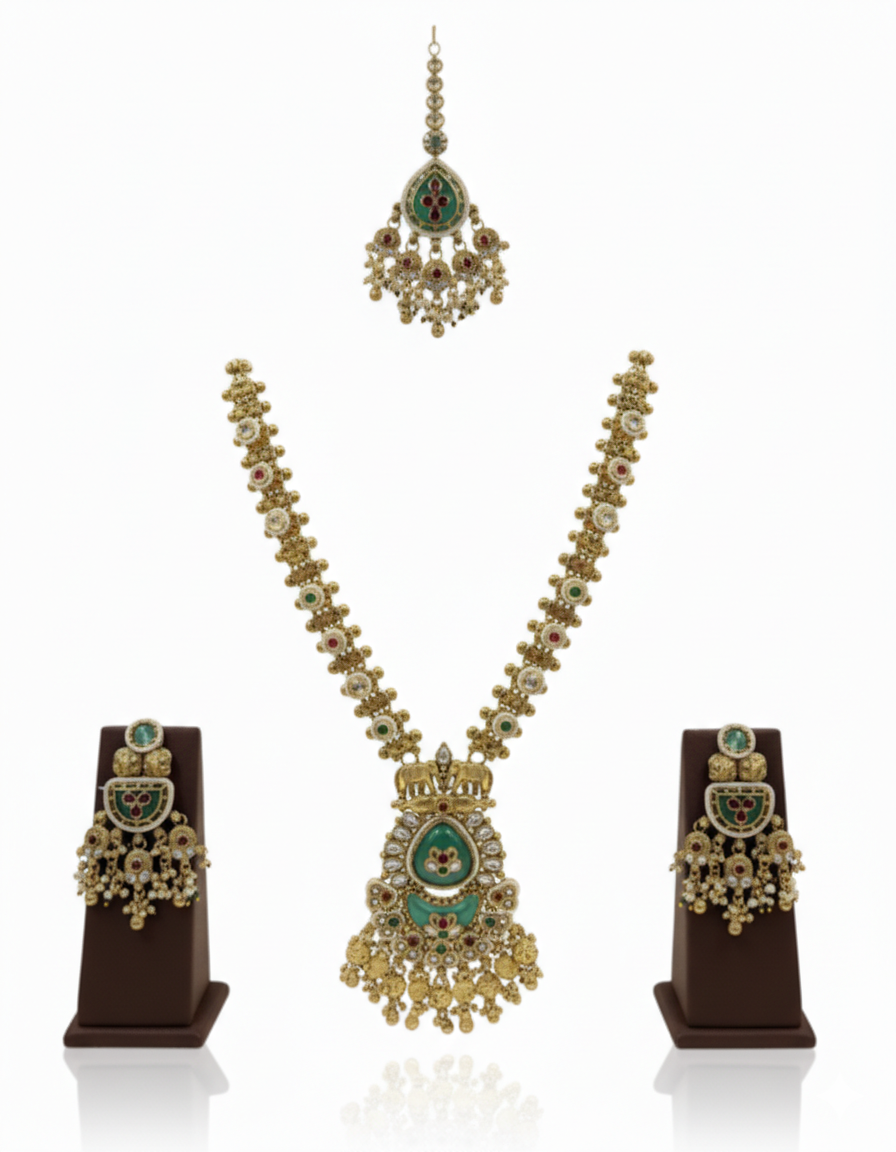 • Gemstone & Enamel Details: Adorned with deep green cabochon stones and ruby-red accents, the set utilizes Meenakari (enameling) and Kundan-style stone setting to create a rich, multi-dimensional texture.