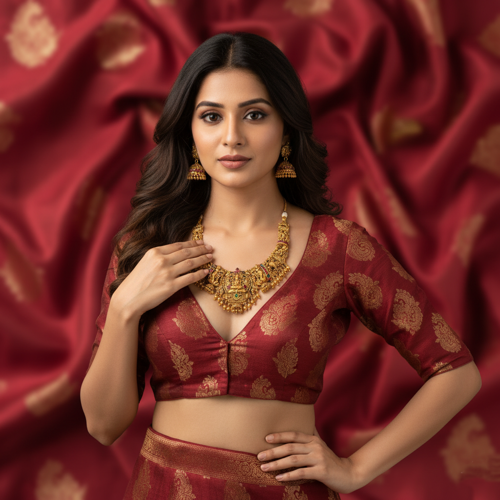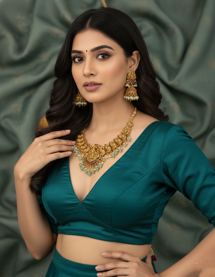 The necklace is elegantly fringed with emerald-green teardrop beads and delicate white seed pearls, creating a graceful movement. Designed for both comfort and style, it comes with an adjustable gold-thread drawstring (dori) to ensure a perfect fit for any neckline. Whether it’s a wedding, a festival, or a grand celebration, this set is designed to make you feel like royalty.