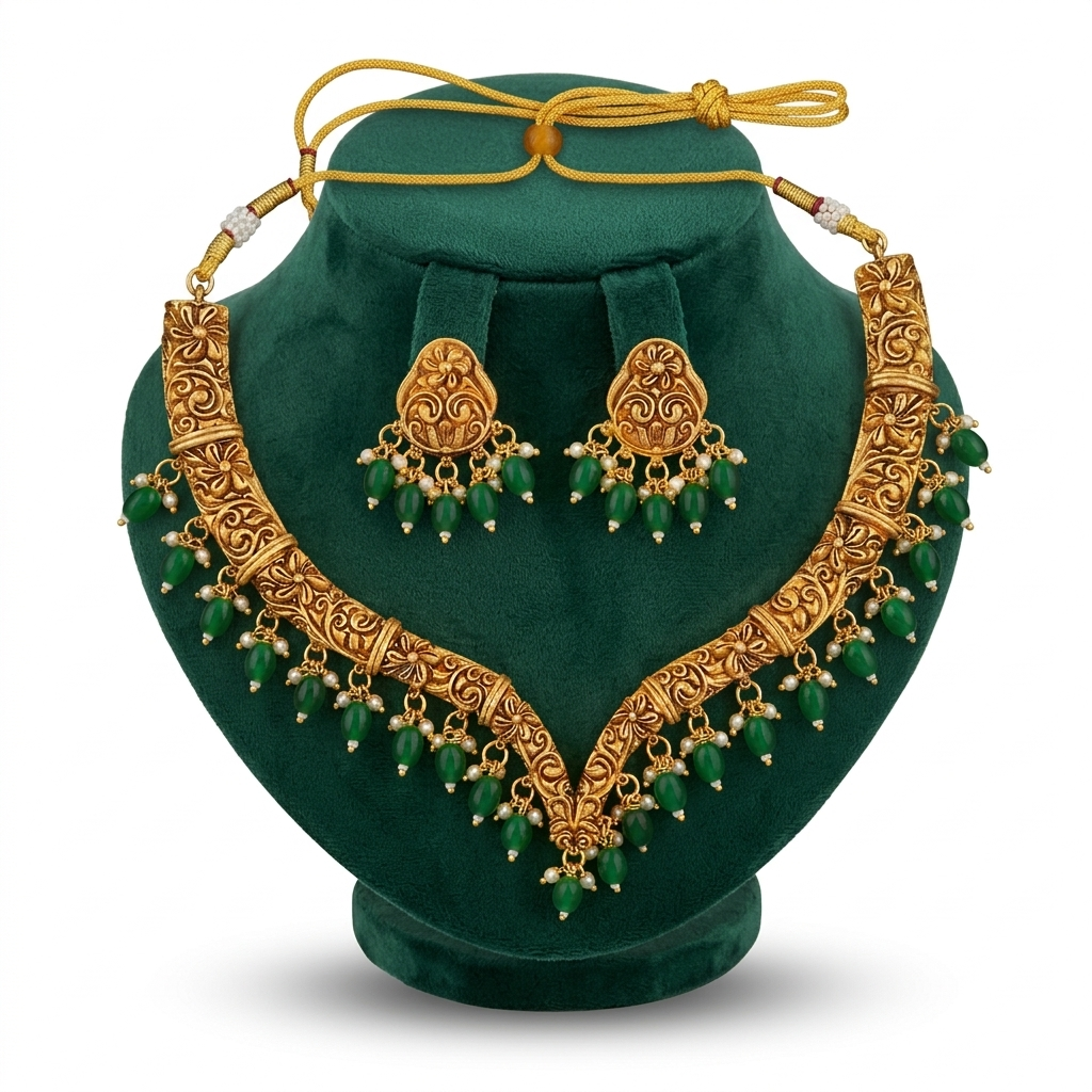 An exquisite antique gold-plated choker set featuring intricate floral filigree and vibrant emerald-green bead droplets. Perfect for adding a touch of royal elegance to any ethnic ensemble.