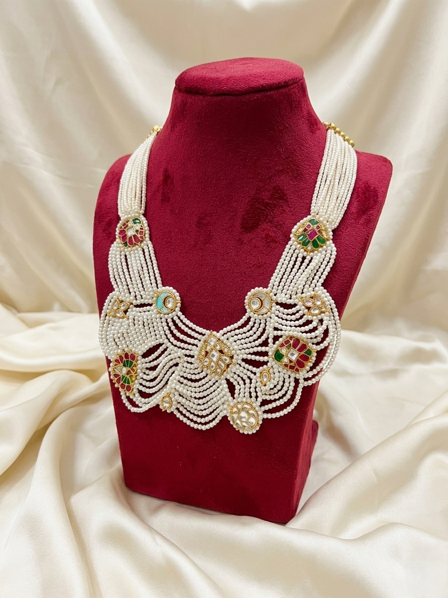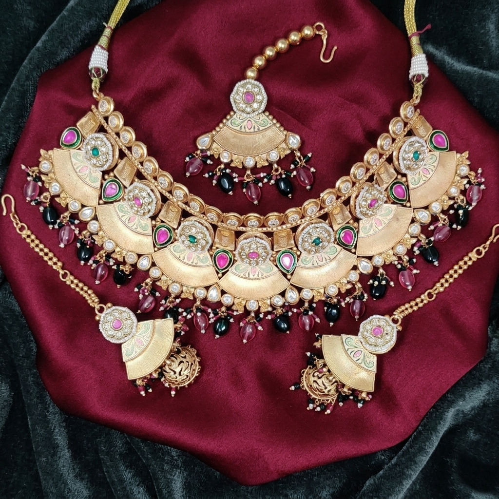 Celebrate timeless elegance with this antique gold floral necklace set, beautifully designed with intricate flower motifs and rich ruby-toned stone accents. The detailed craftsmanship and classic bead lining create a graceful traditional look. Paired with matching floral drop earrings, this set is perfect for weddings, festive occasions, cultural events, and traditional attire.