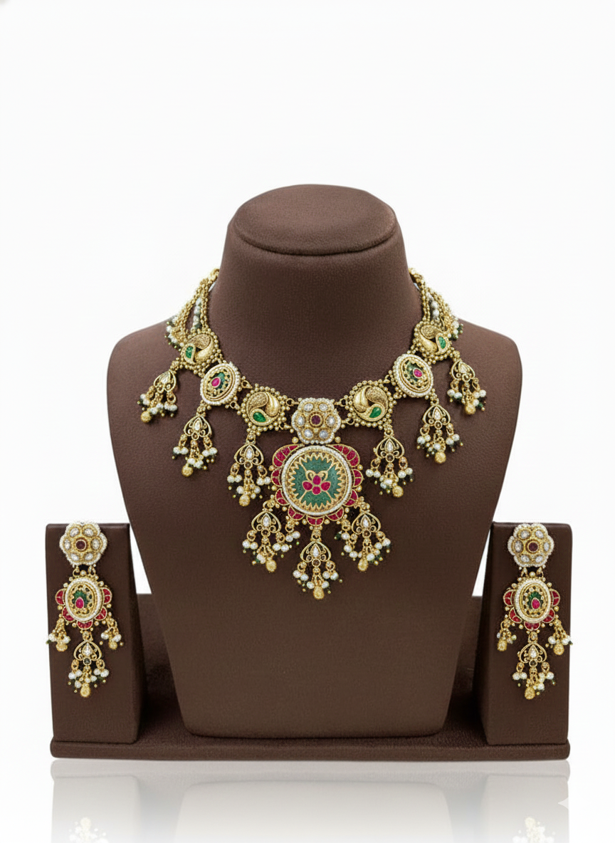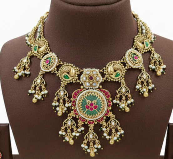 Design & Artistry: The necklace features a central circular medallion adorned with Meenakari (enamel) in deep forest green and ruby red. It is flanked by meticulously carved Peacock (Mayura) motifs, symbols of grace and royalty.