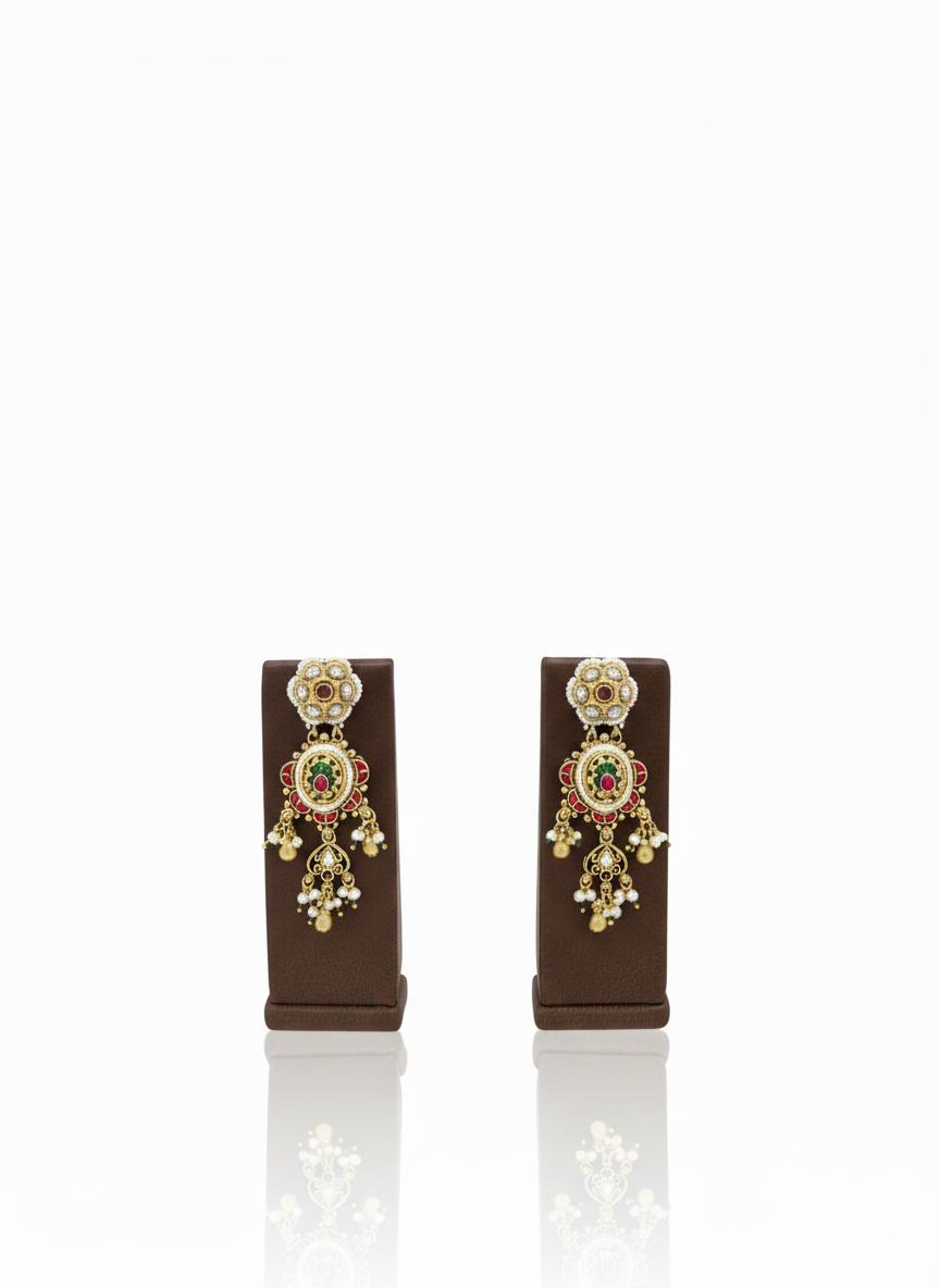 Materials: Set in a premium antique gold-finish base, the piece is embellished with faux rubies, emerald-green stones, and sparkling white polki-style accents.