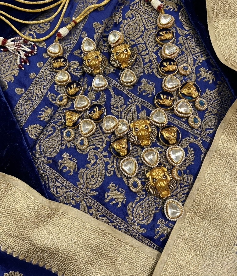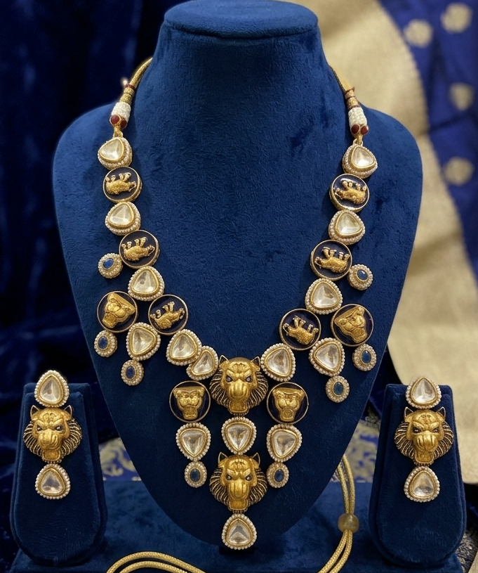 A majestic, handcrafted jewelry set featuring bold Lion (Vyala) motifs in antique gold finish, accented with teardrop Polki stones and deep blue enamel. This regal ensemble captures the essence of heritage royalty, making it a perfect statement piece for weddings and grand festivities