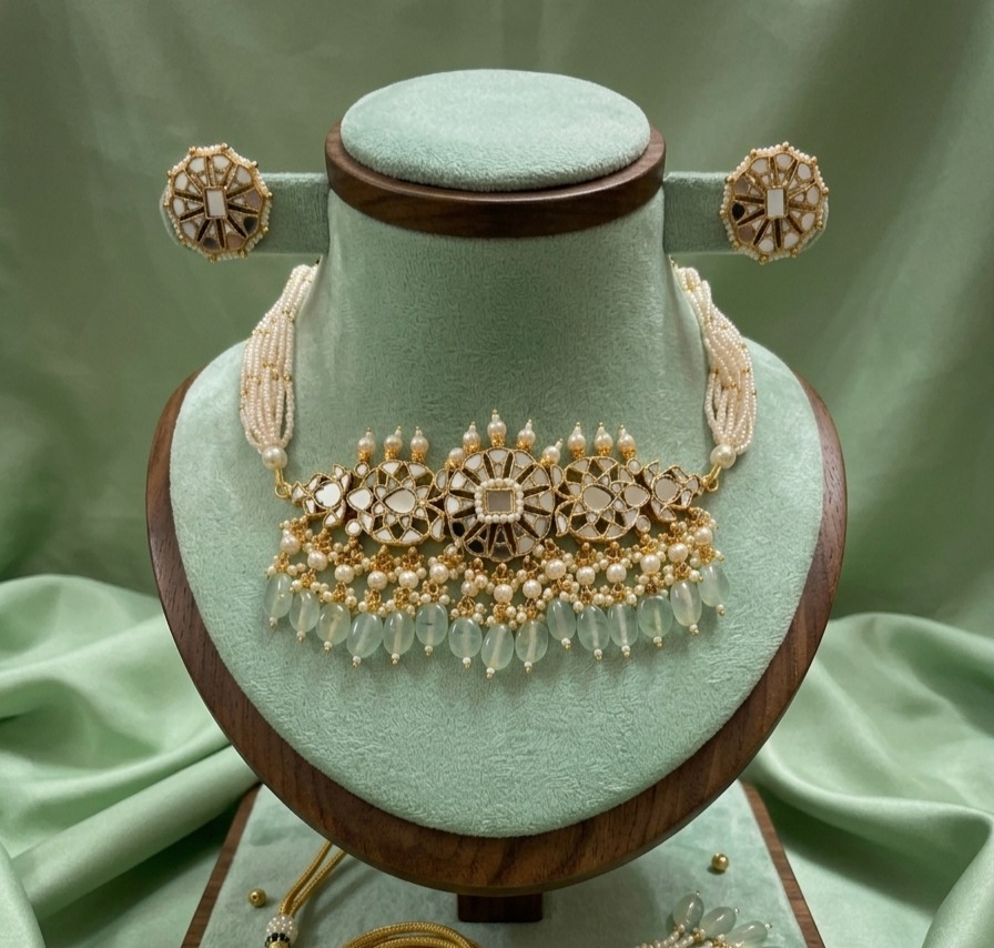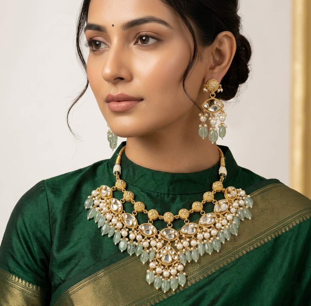 Materials: Gold-plated alloy, high-grade synthetic Polki stones, emerald-green beads, and micro-pearls.
