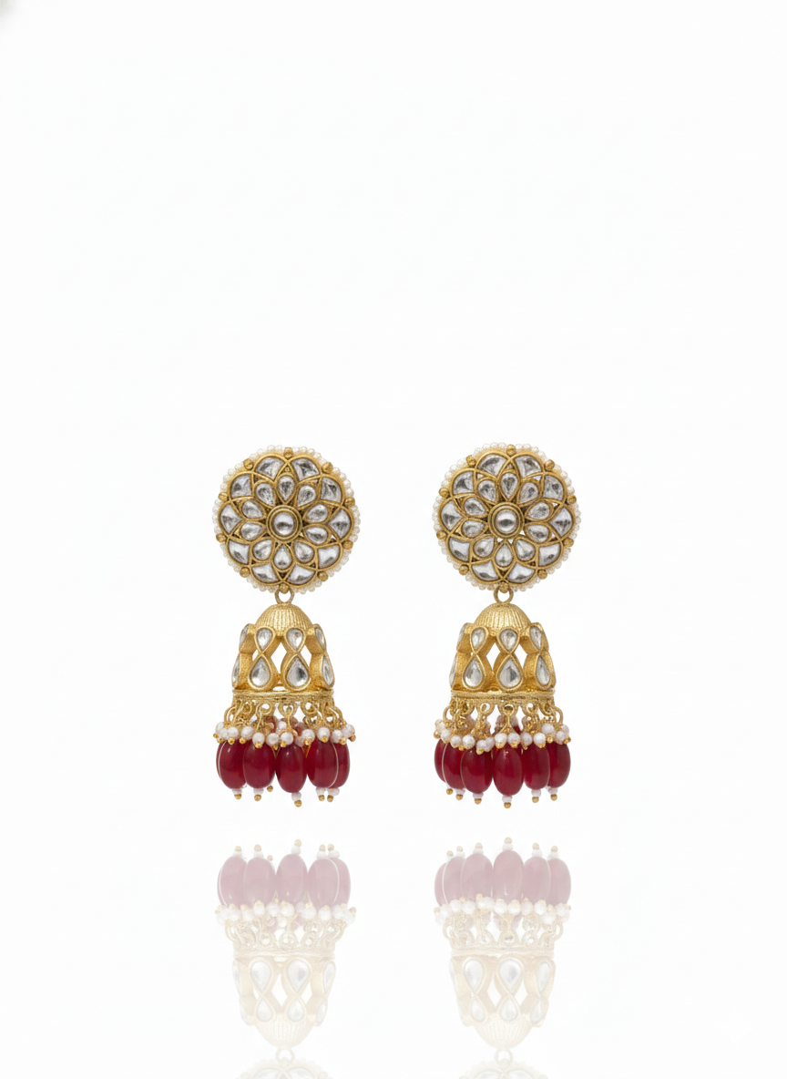 The surface is lavishly embedded with hand-set Kundan crystals in various teardrop and circular shapes, creating a rich, textured brilliance. A fine outer border of ivory seed pearls adds a soft, feminine contrast to the bold metallic structure. These ear-cuffs are perfect for those who want a high-impact accessory that provides more coverage than a standard stud. Whether paired with a traditional saree or a modern fusion gown, these pieces serve as a stunning focal point for weddings, grand celebrations, and festive events.