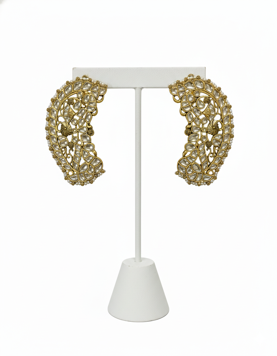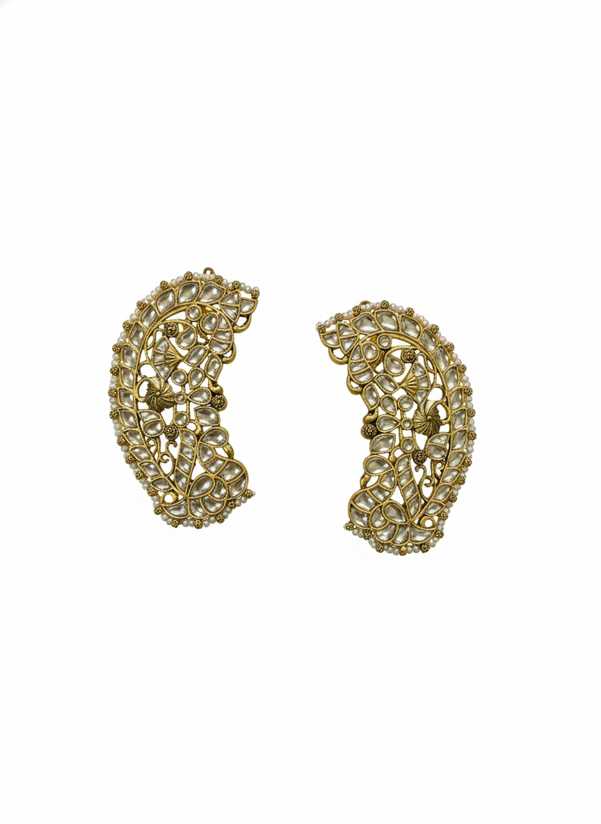 Elegant antique gold-plated ear-cuffs featuring a traditional paisley (Kalki) silhouette. Intricately pavé-set with shimmering Kundan stones and bordered by a delicate row of petite seed pearls, these cuffs offer a timeless, regal look for any festive occasion.