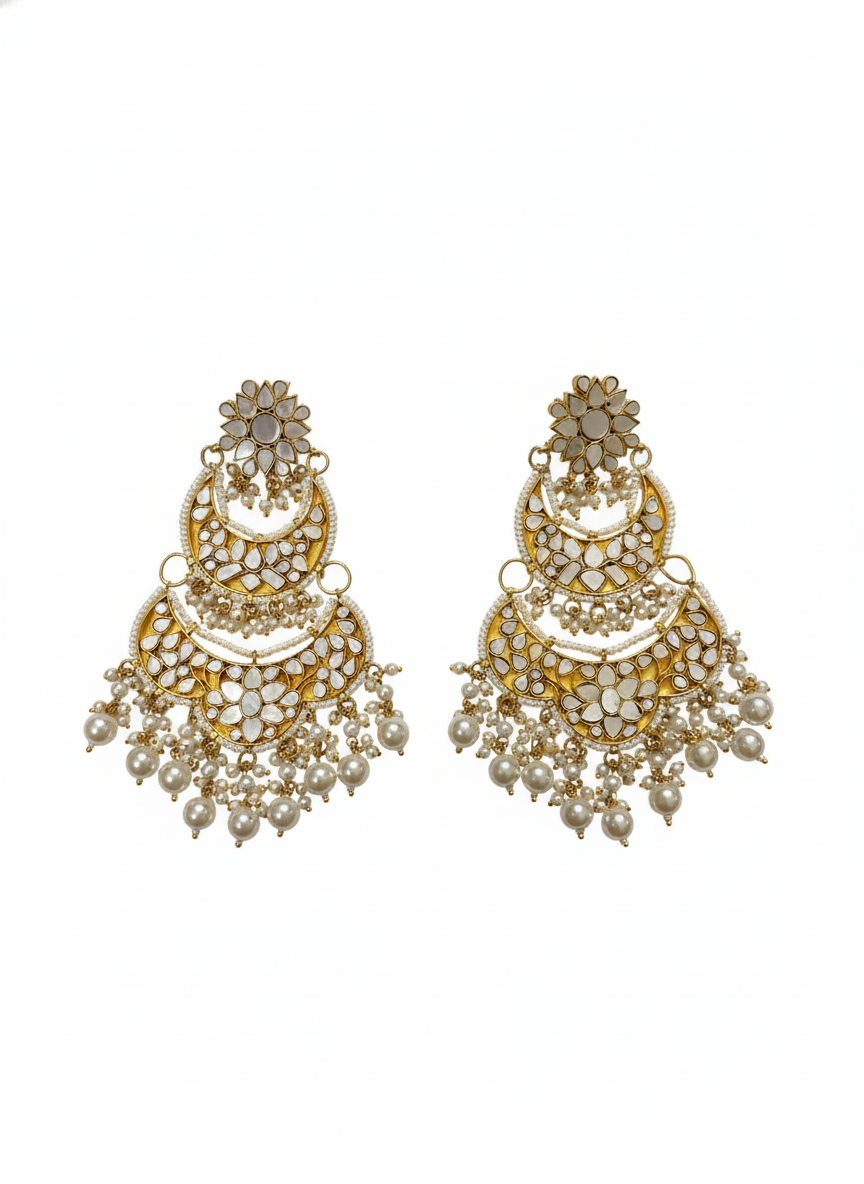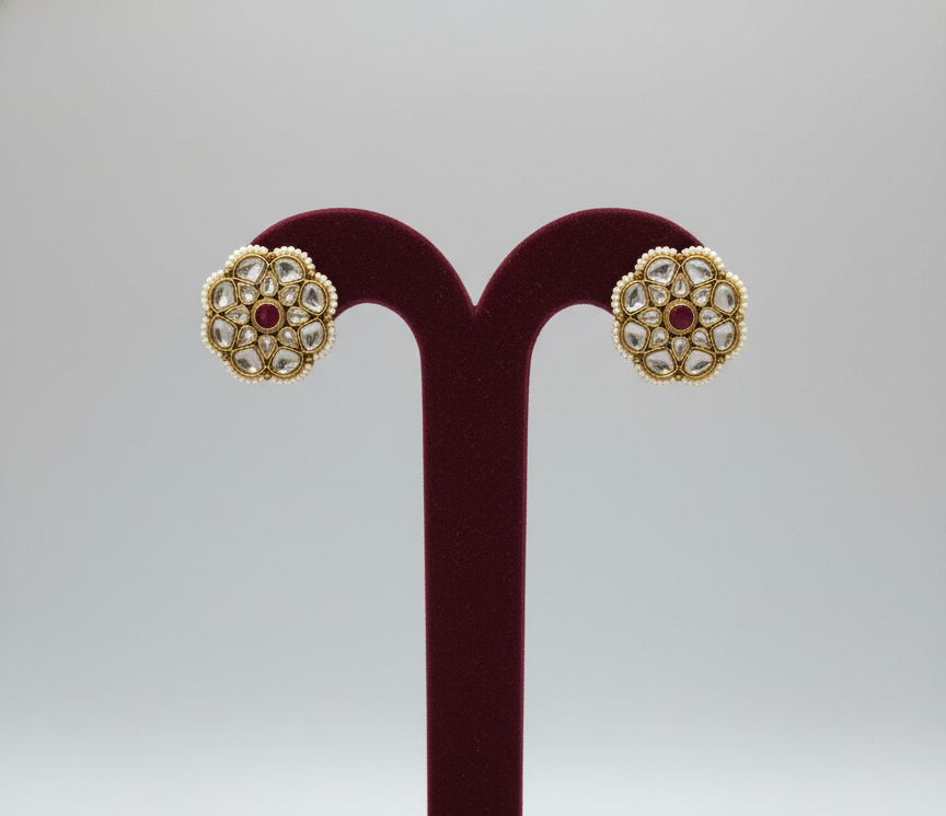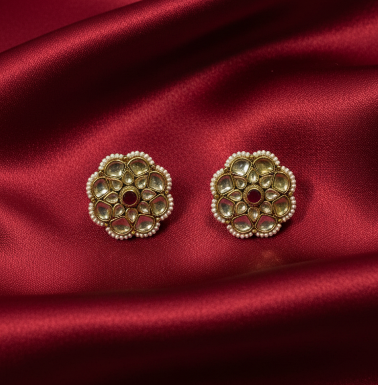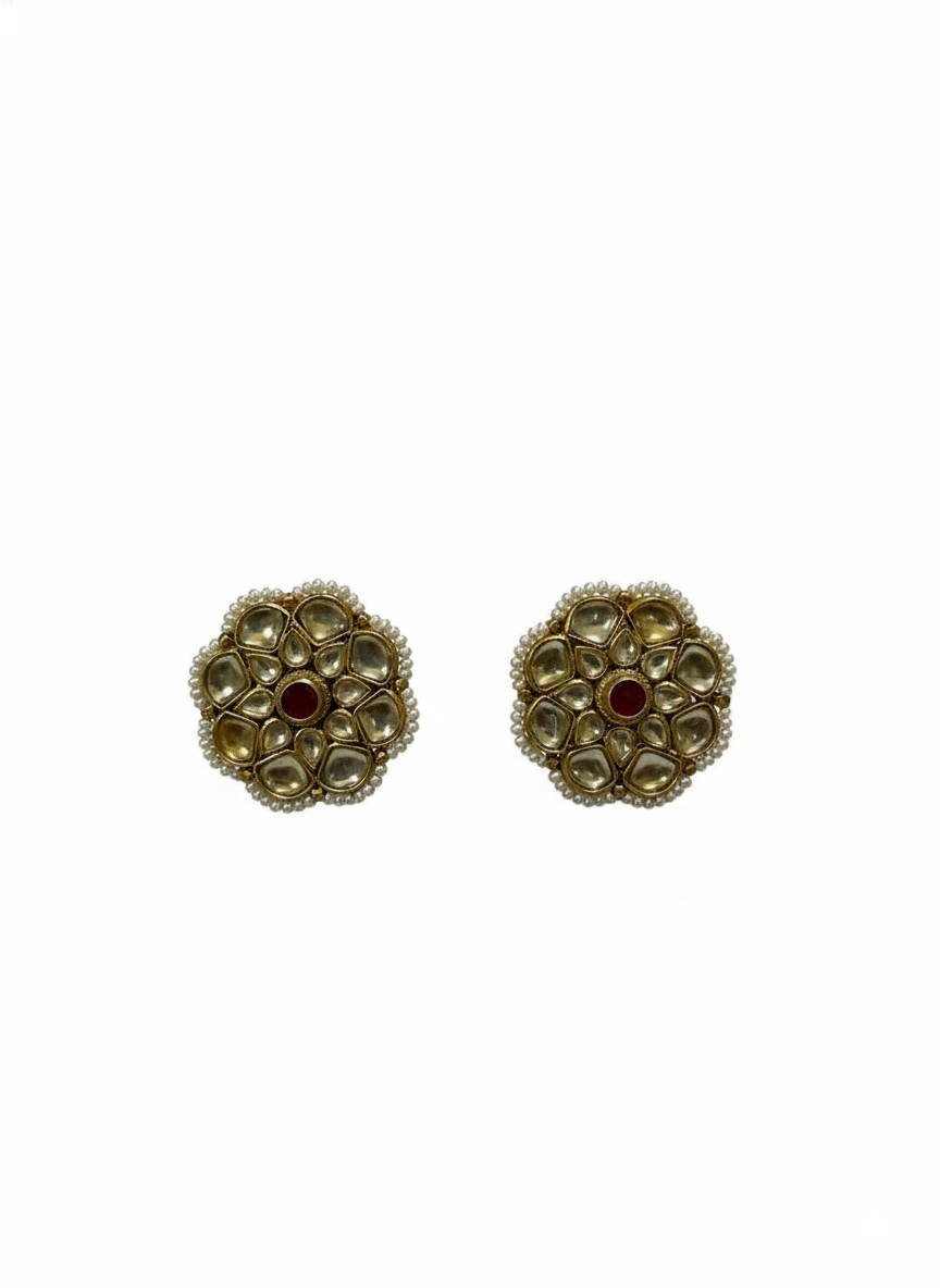 Exude timeless grace with these classic Floral Stud Earrings, a staple for any ethnic jewelry collection. Designed in a traditional blooming flower motif, these studs feature high-quality Polki (uncut diamond) stones set in an antique gold-finish base. At the heart of each flower lies a deep ruby red center stone, providing a rich pop of color. The outer edge is meticulously lined with a delicate border of tiny white seed pearls, adding a soft, feminine touch to the bold craftsmanship. These versatile studs offer a regal look that effortlessly complements both heavy bridal wear and elegant festive outfits.