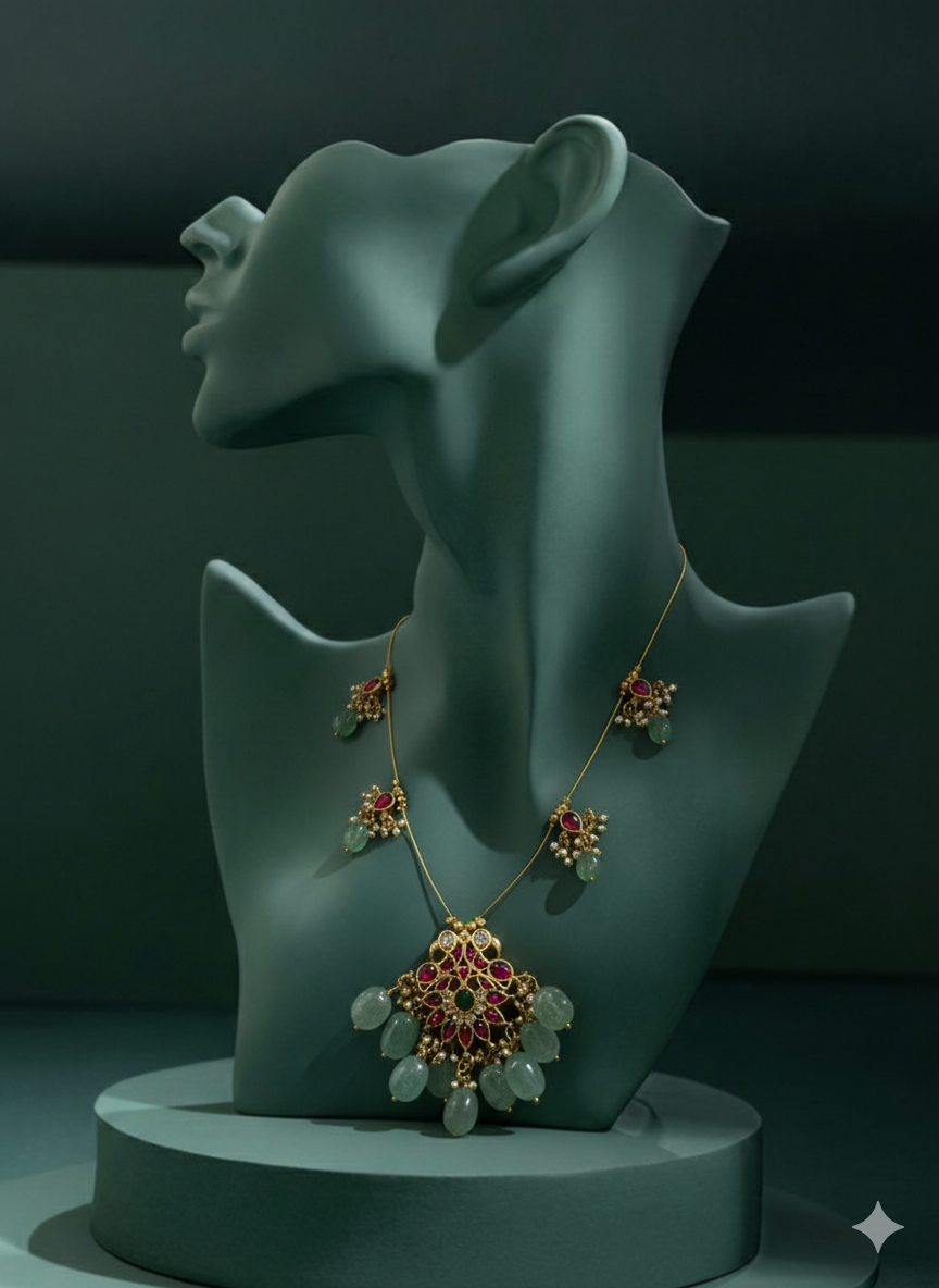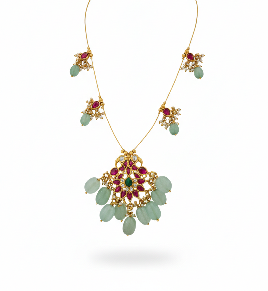 A sophisticated take on the classic Guttapusalu style, featuring a central floral pendant accented by symmetrical side clusters.
