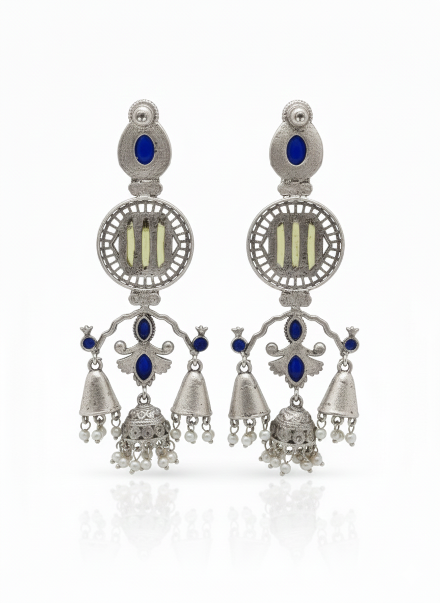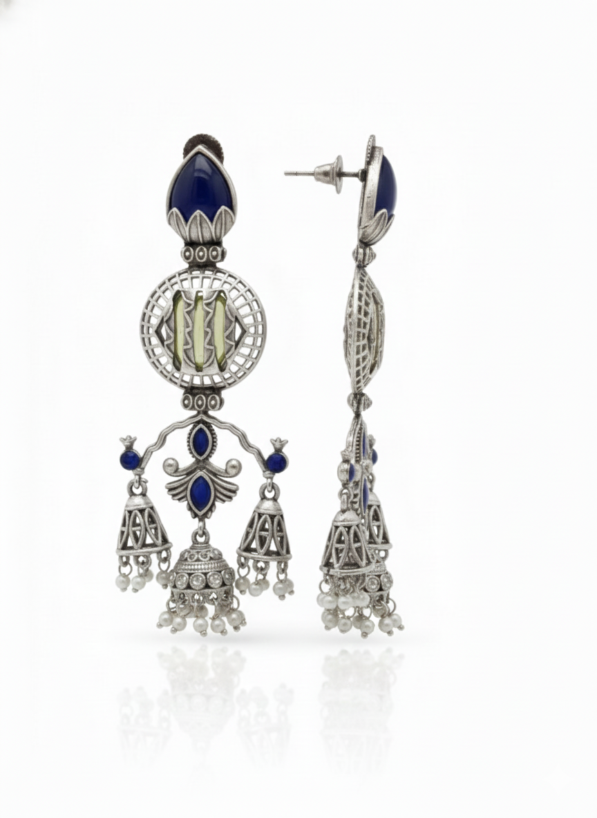 These earrings showcase a beautifully detailed, traditional jhumka-inspired design that blends artistry with cultural elegance. The upper section features a polished deep blue enamel teardrop framed by silver motifs, leading into a circular centerpiece adorned with geometric patterns in subtle green and silver tones. Below, an ornate branch-like structure holds multiple blue enamel elements and fan-shaped silver motifs, adding both symmetry and character. The highlight of the earrings is the trio of intricately carved jhumka bells, each embellished with tiny pearl-like beads that sway gracefully with movement. Rich in detail and craftsmanship, these earrings exude a regal charm—perfect for festive occasions, cultural celebrations, or elevating any traditional ensemble.