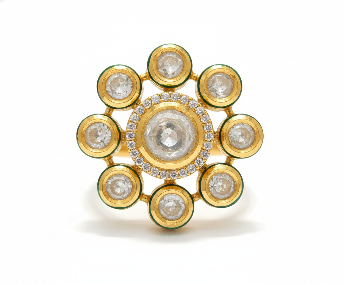 The center stone is dramatically framed by a multi-layered, sunburst halo. The inner tier features a seamless border of round diamonds, while the outer tier consists of twelve distinct, petal-shaped motifs—each individually set with brilliant-cut diamonds and accented with fine milgrain beading. The architectural openwork between the petals adds a sense of lightness and depth to the substantial medallion. Crafted in radiant yellow gold, this piece serves as a timeless heirloom, ideal for high-luxury catalogs, milestone anniversaries, or as a unique engagement statement.