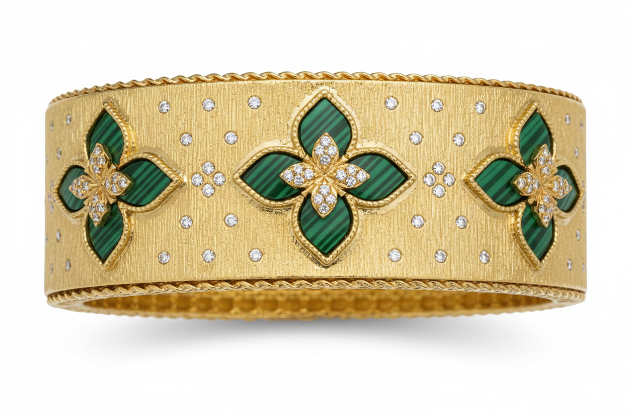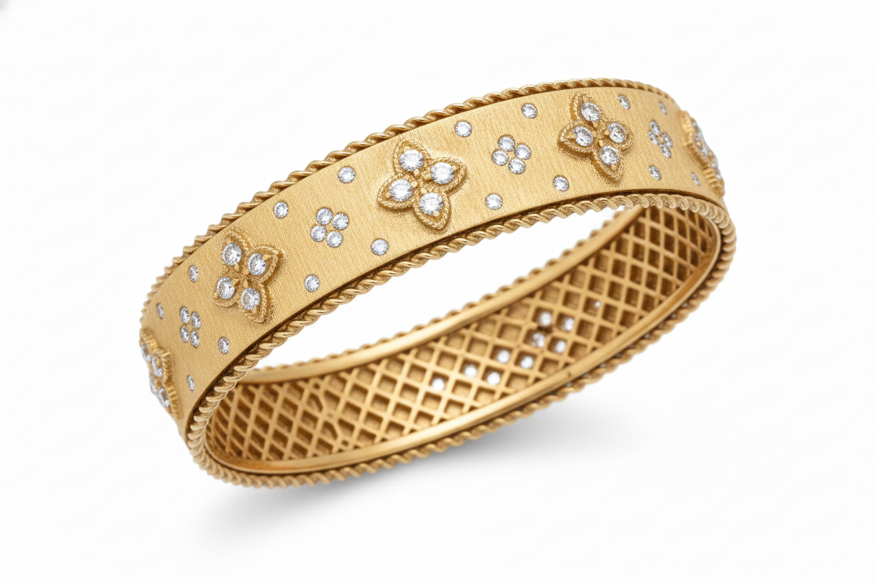 Exuding old-world charm and meticulous craftsmanship, this wide-band bangle is crafted in 18K yellow gold-tone metal with a signature satin-brushed finish. It features ornate four-petal floral pavé motifs and delicate bezel-set accents, all elegantly framed by traditional twisted rope borders.