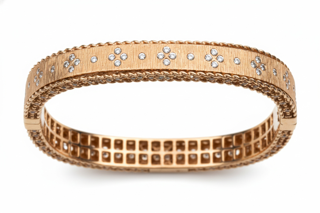 The architectural integrity of the piece is enhanced by dual rope-twist edges, lending the design a vintage, heirloom quality. For superior comfort and light play, the interior is finished with a precision-cut honeycomb open-work gallery. Secured with a seamless integrated hinge and a heavy-duty safety clasp, this bangle is designed to be a definitive “power accessory” for any formal jewelry collection.