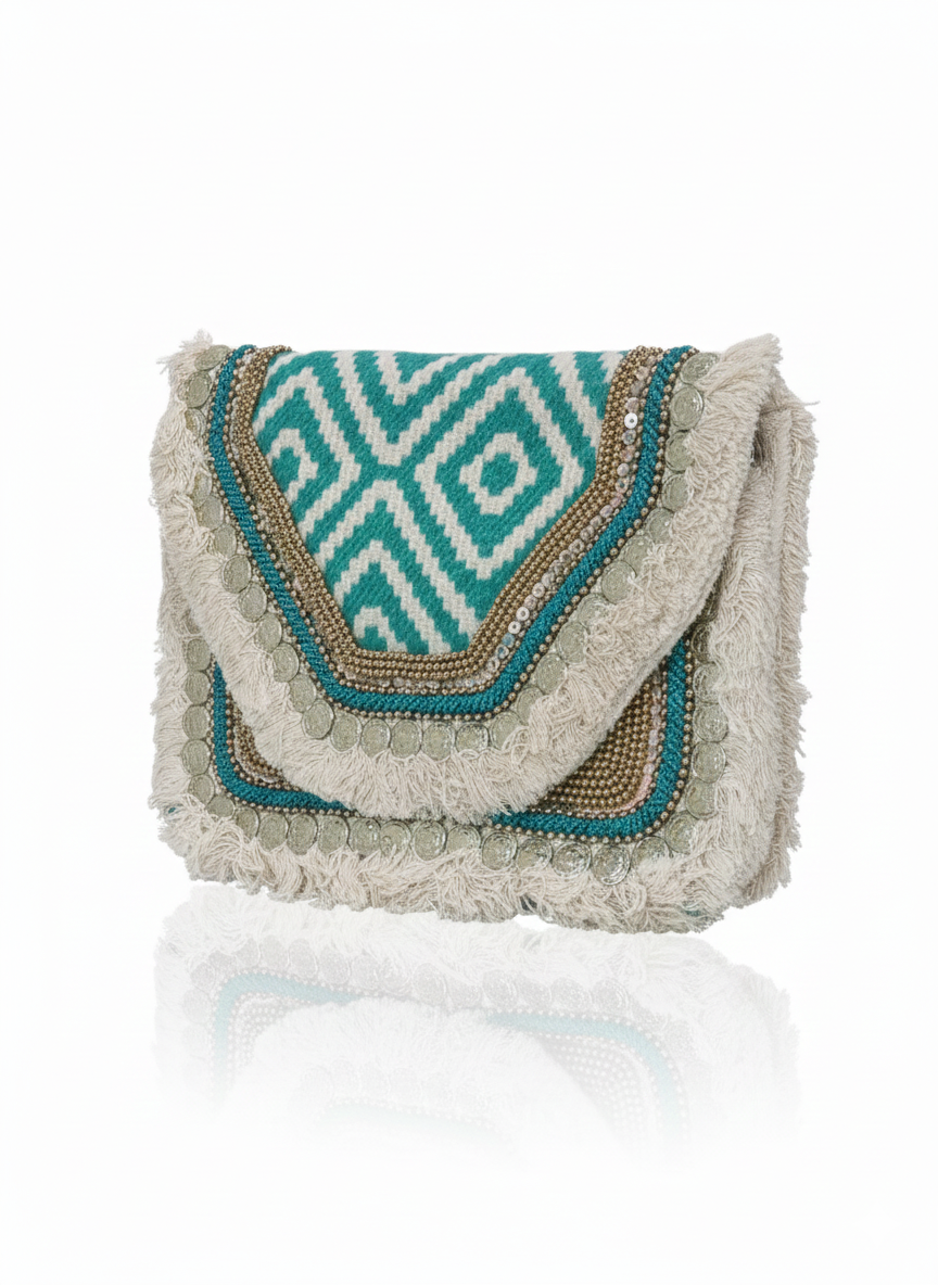 A vibrant boho-chic clutch featuring a teal geometric weave, intricate metallic beadwork, and silver coin accents. Finished with a soft cream fringe, it is the perfect statement piece for a festive and eclectic wardrobe.