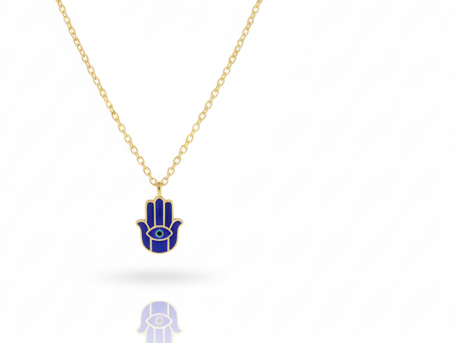 Embrace the spirit of positivity with the Azure Guardian Hamsa Necklace. This piece centers on a beautifully crafted Hamsa hand pendant, meticulously inlaid with rich cobalt blue enamel that contrasts strikingly against its high-polish gold frame. At the palm’s center lies a delicate evil eye detail, further enhancing the pendant’s symbolic power as a protective talisman.