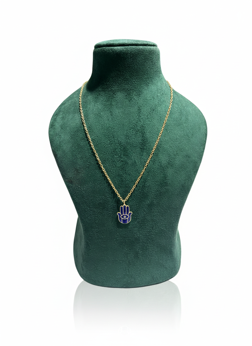A modern gold-finish necklace featuring a deep blue enamel Hamsa hand pendant. A meaningful and stylish accessory designed to bring protection and positive energy to your daily ensemble.
