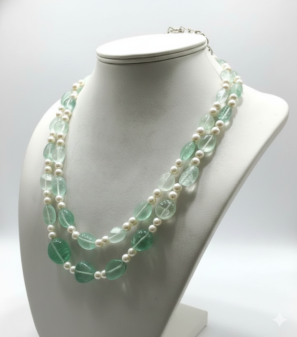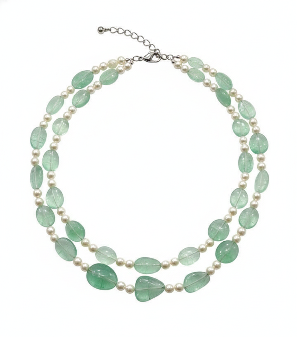 A stunning double-strand necklace featuring translucent tumbled green stones and high-luster white pearls. An elegant, tiered accessory that combines organic beauty with timeless sophistication.