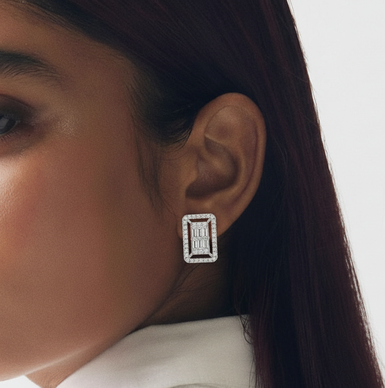 Sophisticated silver-finish rectangular stud earrings featuring a sleek baguette-cut diamond center and a brilliant round-stone halo. A modern, architectural design that offers high-end brilliance and timeless style.