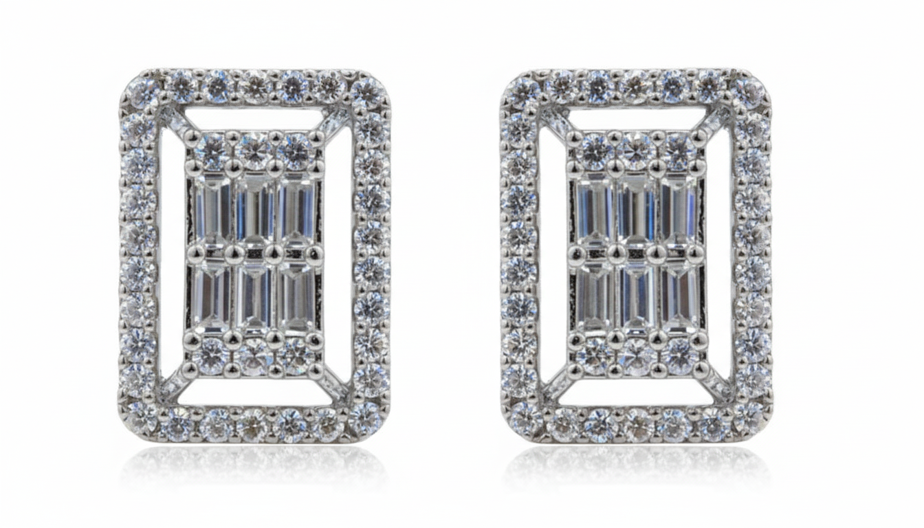 Define modern luxury with these geometrically striking Rectangular Halo Stud Earrings. The center of each earring features a sophisticated grid of precision-cut tapered baguette diamonds, creating a sleek, mirror-like surface of light. This architectural core is framed by a dual-layered halo of shimmering round brilliant-cut stones, set in a high-polish silver-tone mounting. The open-work design between the tiers adds a sense of depth and airiness, allowing for maximum light refraction. These versatile studs offer a bold, contemporary aesthetic that is perfect for professional settings, upscale evening events, or as a chic bridal accessory