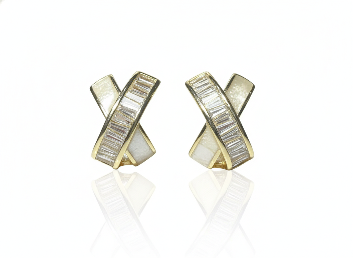 Sophisticated gold-plated stud earrings featuring a contemporary criss-cross “X” design. One band is finished with smooth white enamel, while the intersecting band is channel-set with brilliant baguette-cut cubic zirconia for a sleek, geometric glow.