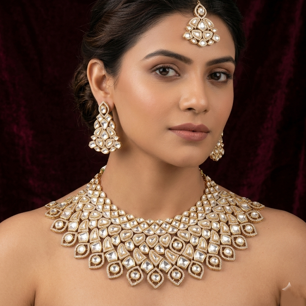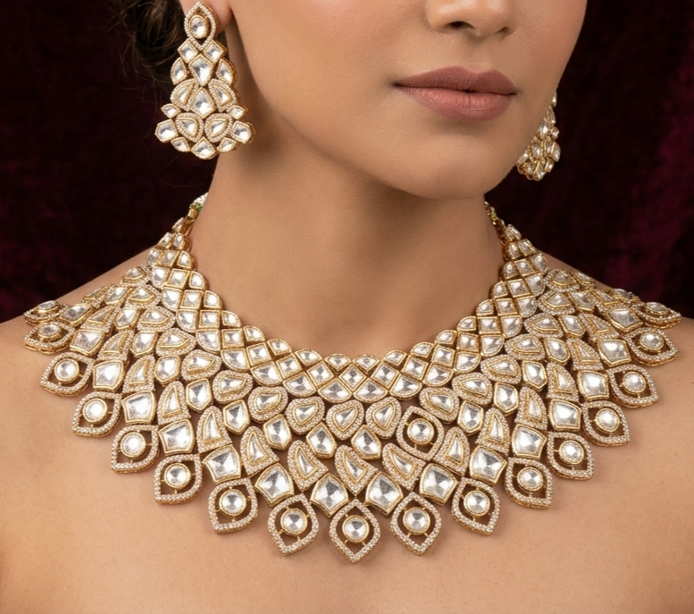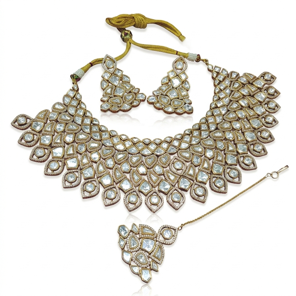Make a grand statement with this exquisite handcrafted Kundan and Polki jewelry set, designed for the modern bride and traditional celebrations. This opulent set features a wide, multi-layered choker necklace with a scalloped edge, showcasing high-luster uncut stones framed by intricate gold-toned metalwork.