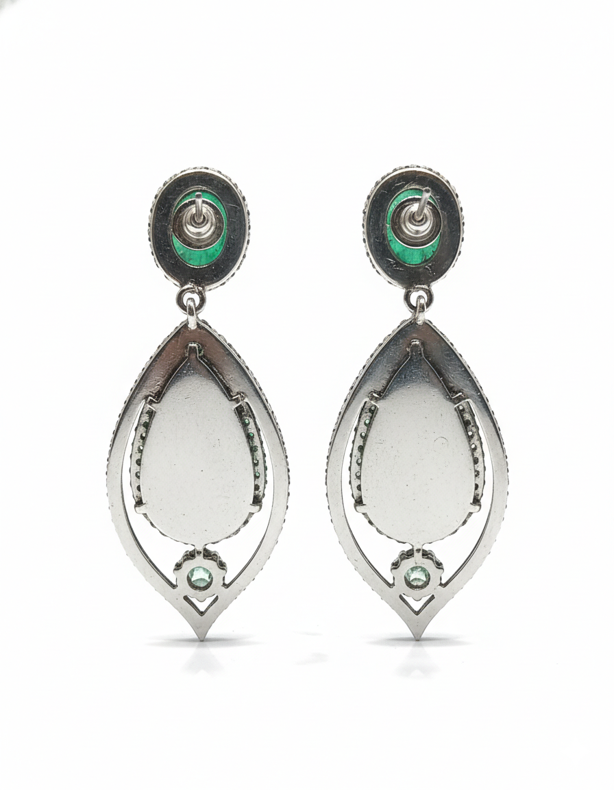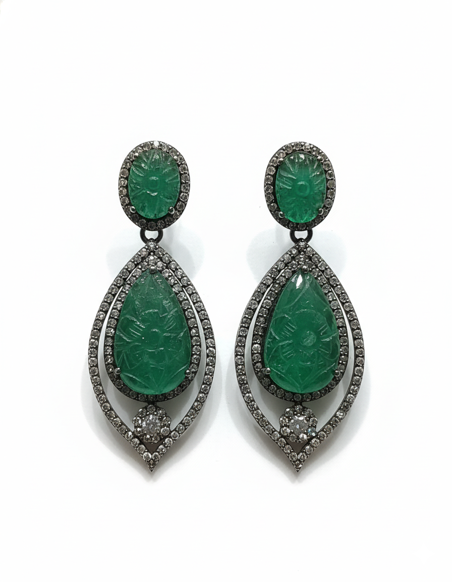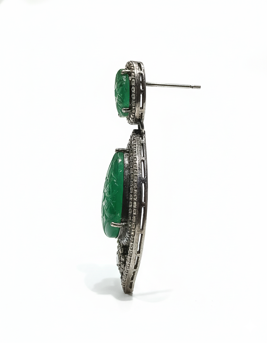 Make a bold yet elegant statement with these exquisite drop earrings featuring hand-carved green stones in a graceful floral motif. Set within an elongated antique-finish frame and accented with shimmering diamond-style stones, these earrings offer a perfect balance of artistry and sophistication. Their fluid silhouette and rich color make them ideal for weddings, evening events, and festive celebrations where timeless glamour is desired.