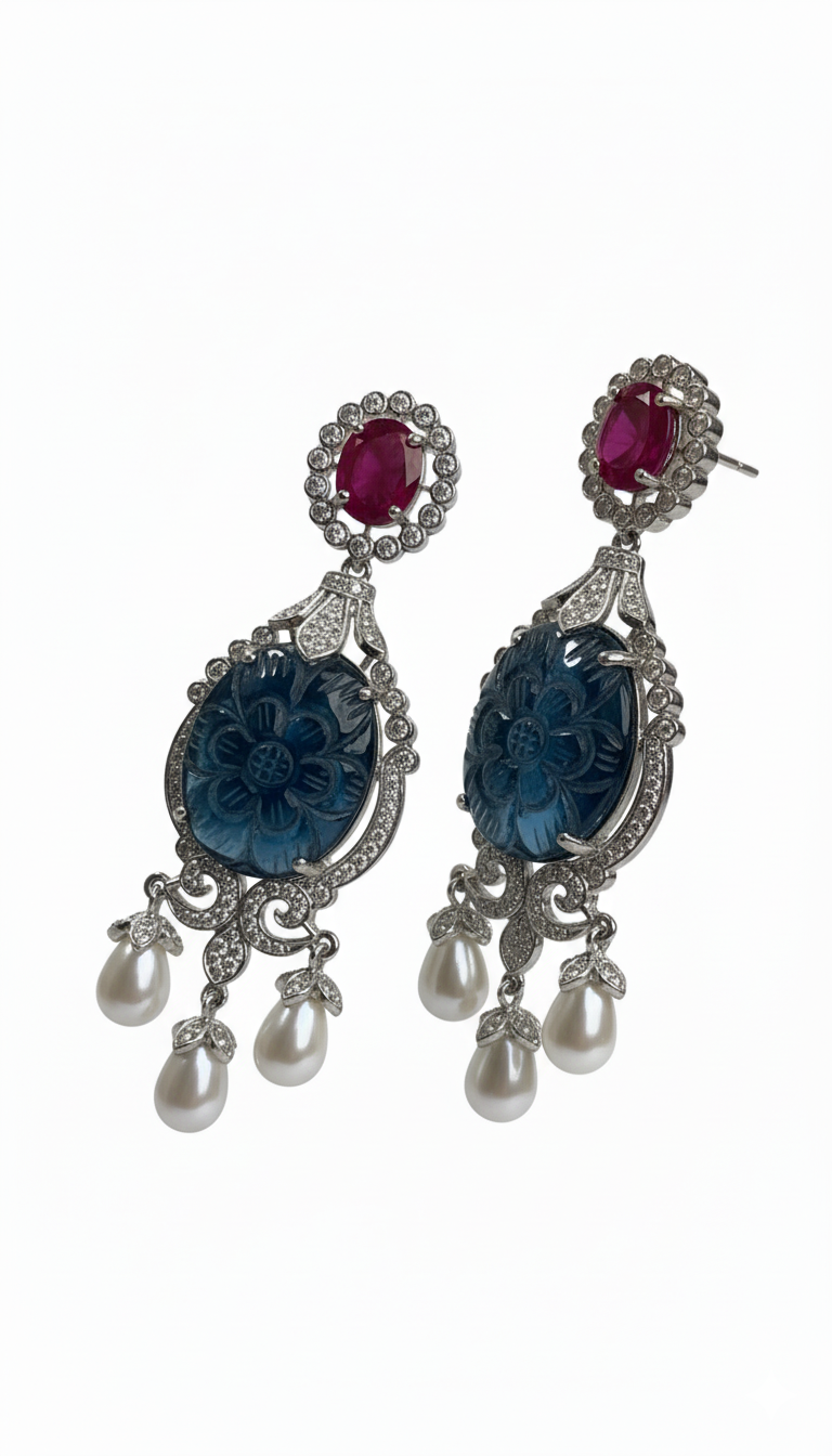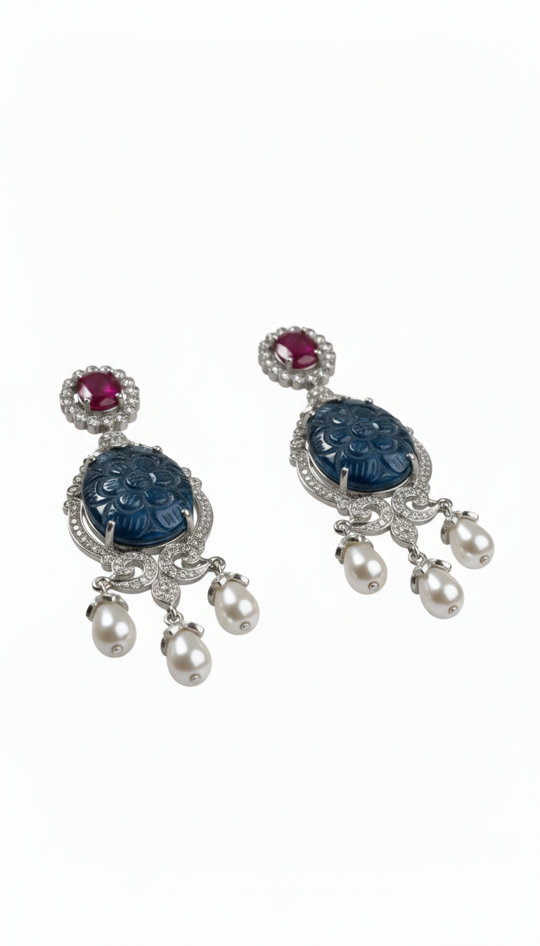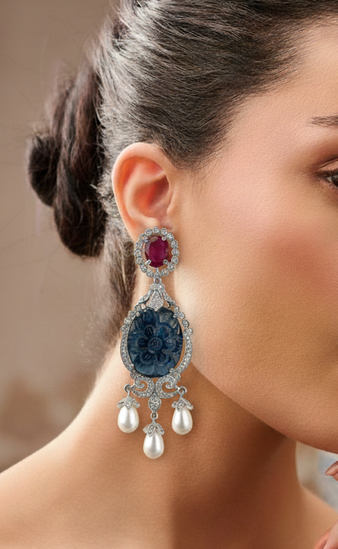 Step into a world of vintage opulence with these magnificent Victorian-style drop earrings. The design features a stunning duo of precious gemstones: a vibrant, oval-cut ruby stud encircled by a halo of shimmering diamonds, leading down to a breathtaking centerpiece of carved blue sapphire. The sapphire is intricately engraved with a traditional floral motif, framed by delicate silver-finish scrollwork and pavé-set stones. Finished with a trio of lustrous teardrop pearls that sway with every movement, these earrings are a true testament to high-end artisanal craftsmanship. They are the perfect statement piece for gala dinners, weddings, or any occasion requiring a touch of royal grandeur.