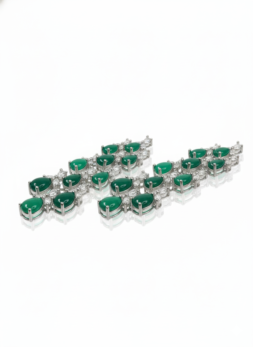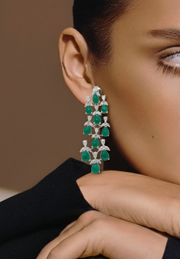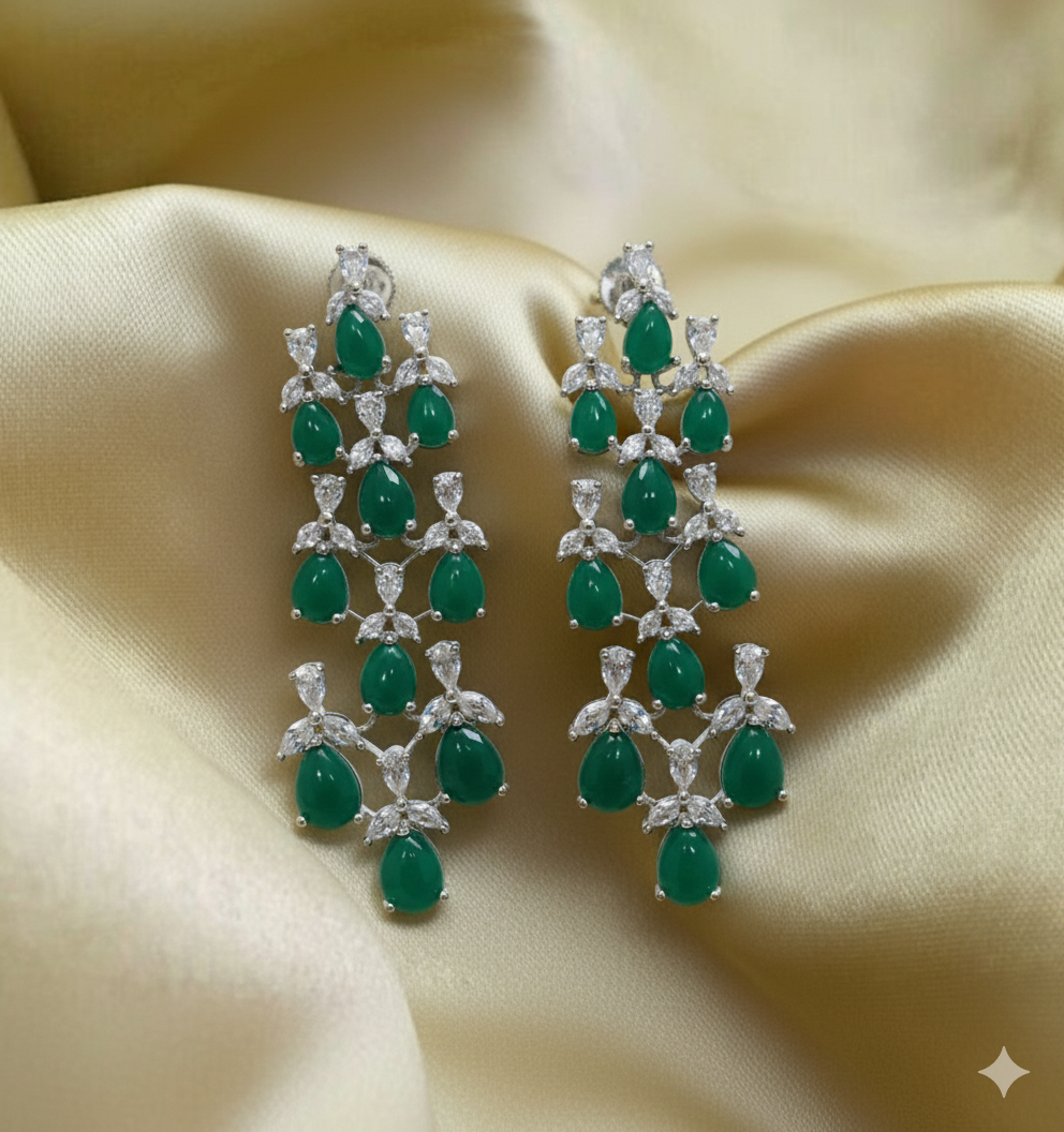 Make a majestic statement with these breathtaking Emerald Chandelier Earrings. Designed with a regal, multi-tiered silhouette, each earring features a cascading arrangement of vibrant, pear-cut emerald green stones. These rich green teardrops are held in place by an intricate silver-finish framework, meticulously accented with shimmering marquise and round-cut white stones that provide a brilliant, icy contrast. The tiered design offers fluid movement and a sense of architectural grandeur, reminiscent of classic royal heirlooms. Perfect for high-profile weddings, grand galas, or festive celebrations, these earrings are crafted for those who want to command attention with timeless elegance and bold color.