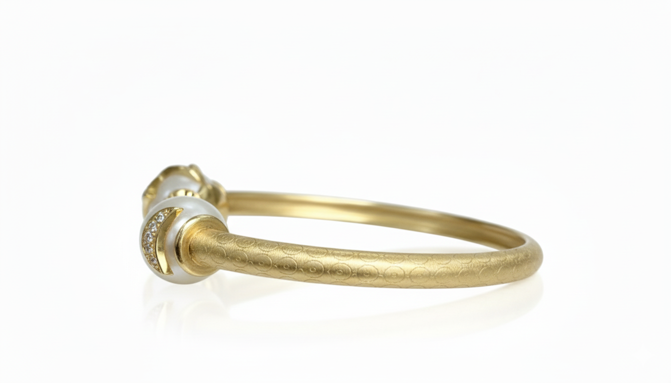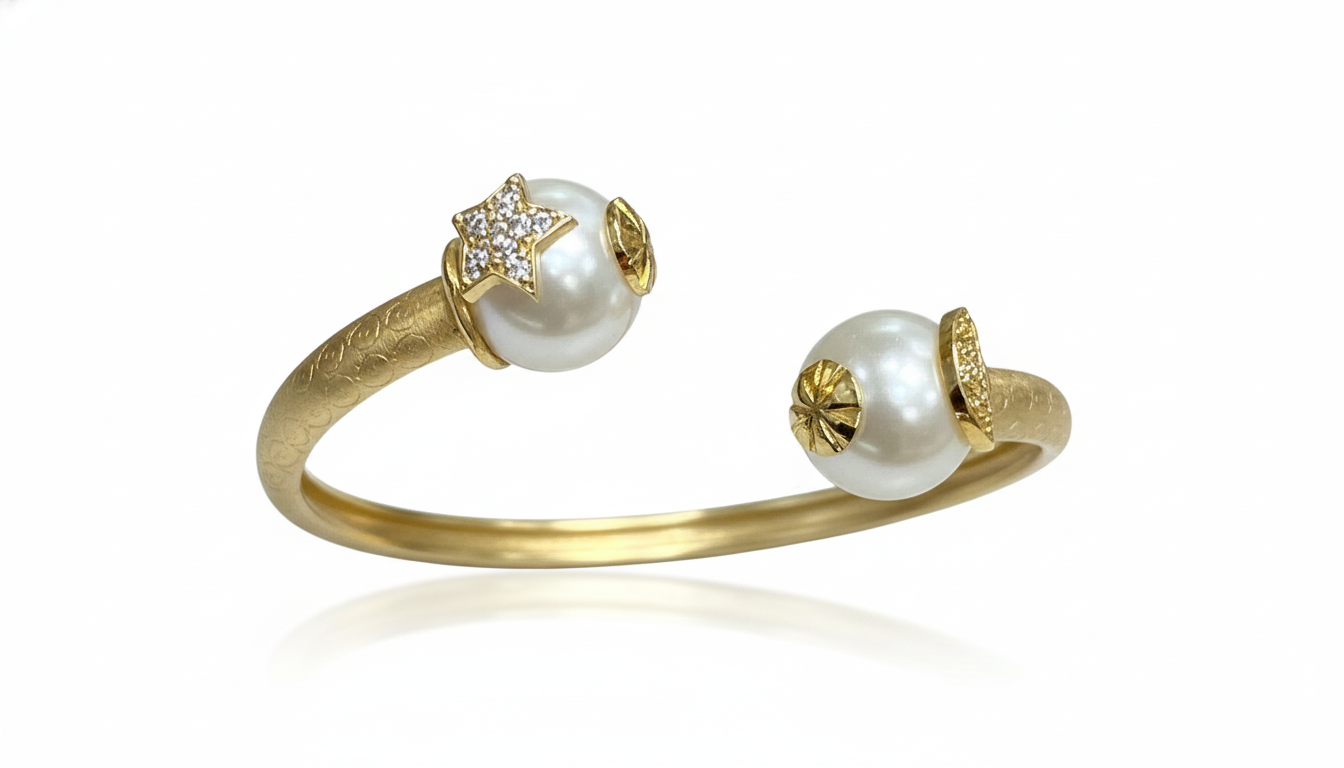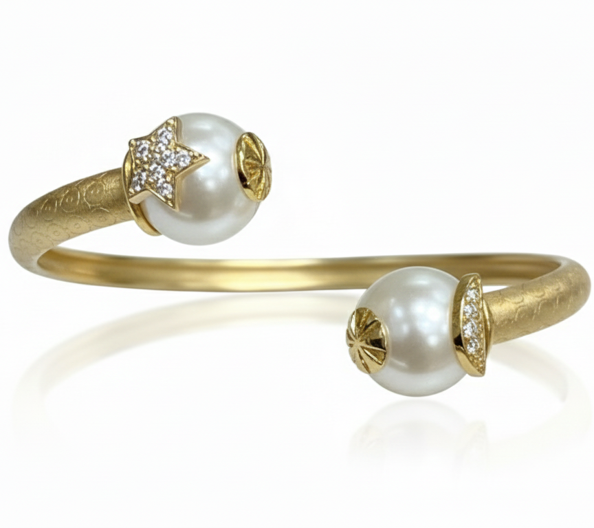 At either end of the open band sit two exquisite, high-luster white pearls. One pearl is crowned with a brilliant diamond-pave star, while the other is finished with intricate, hand-carved golden sunburst caps. The band itself features a subtle, hammered scroll pattern that adds depth and an artisanal touch to the piece. Whether worn alone as a statement piece or layered with other gold bangles, this bracelet captures the magic of the night sky in a wearable, luxurious form.