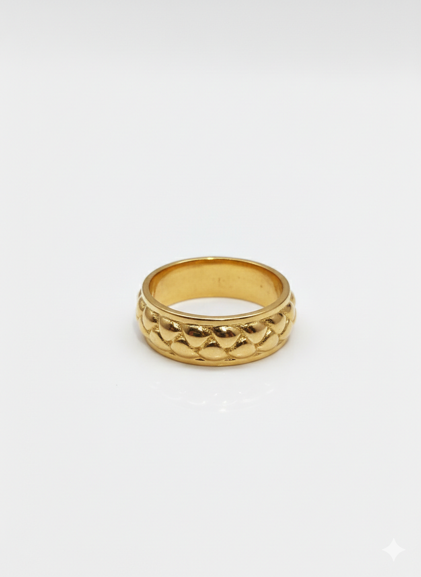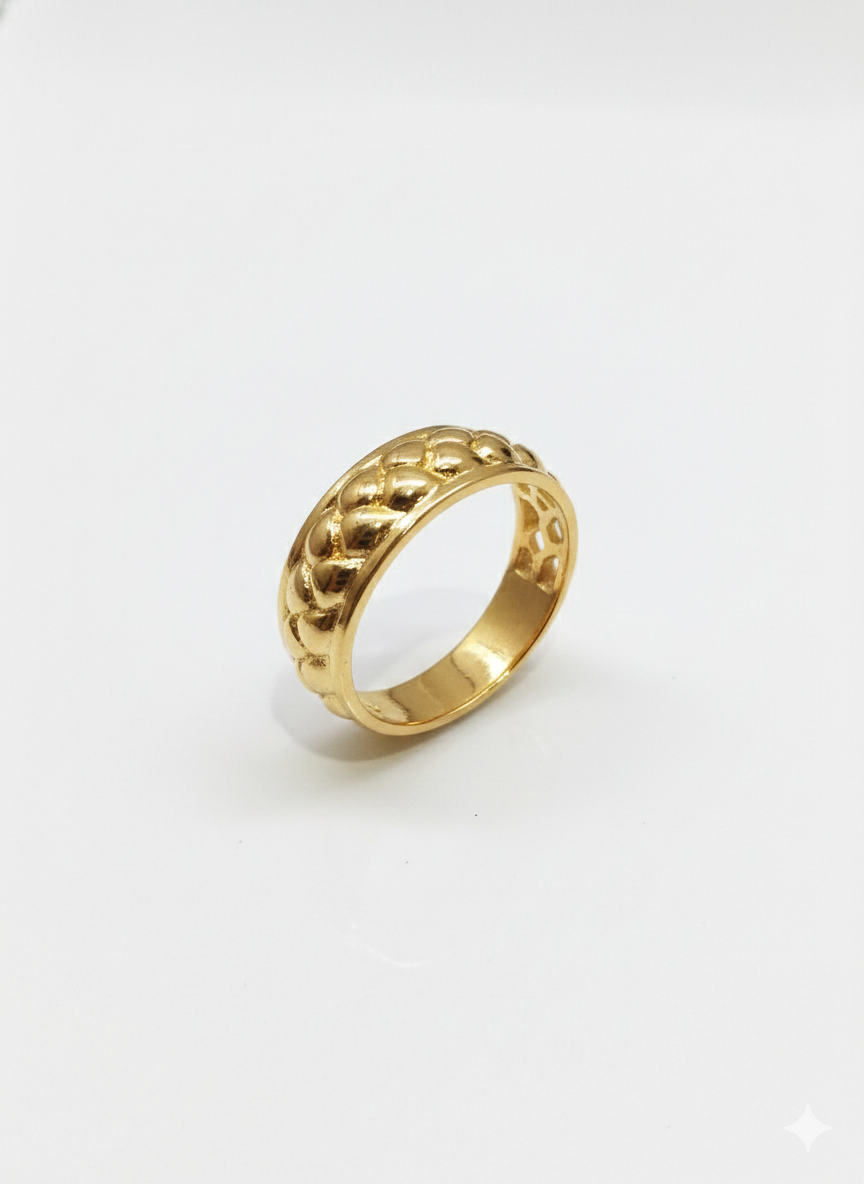 Timeless design meets modern craftsmanship in this gold-plated textured band. Featuring a beautiful interwoven braid motif embossed around the circumference, this ring offers a rich, tactile feel and a radiant glow. Its classic silhouette makes it an essential accessory for both daily wear and special occasions.