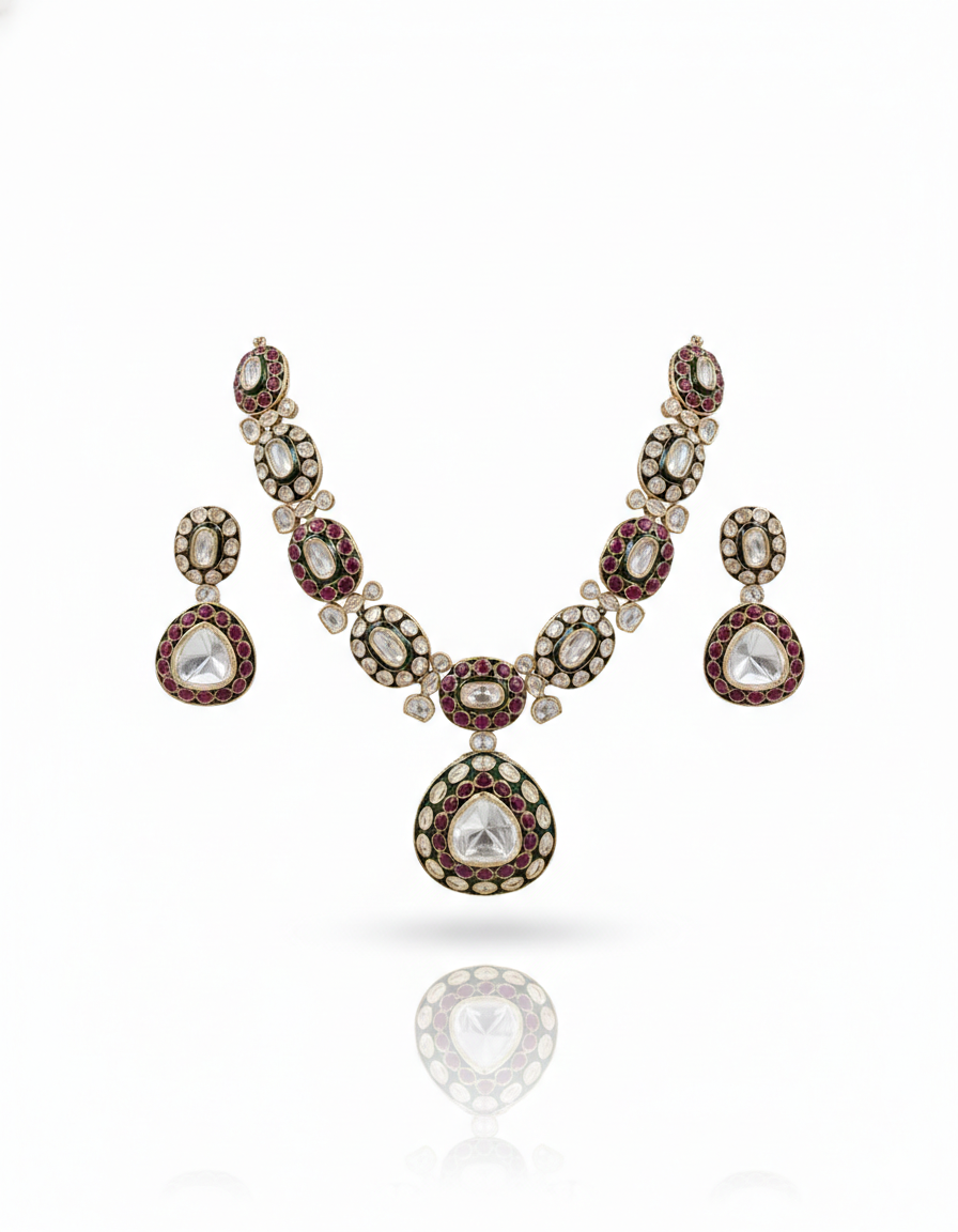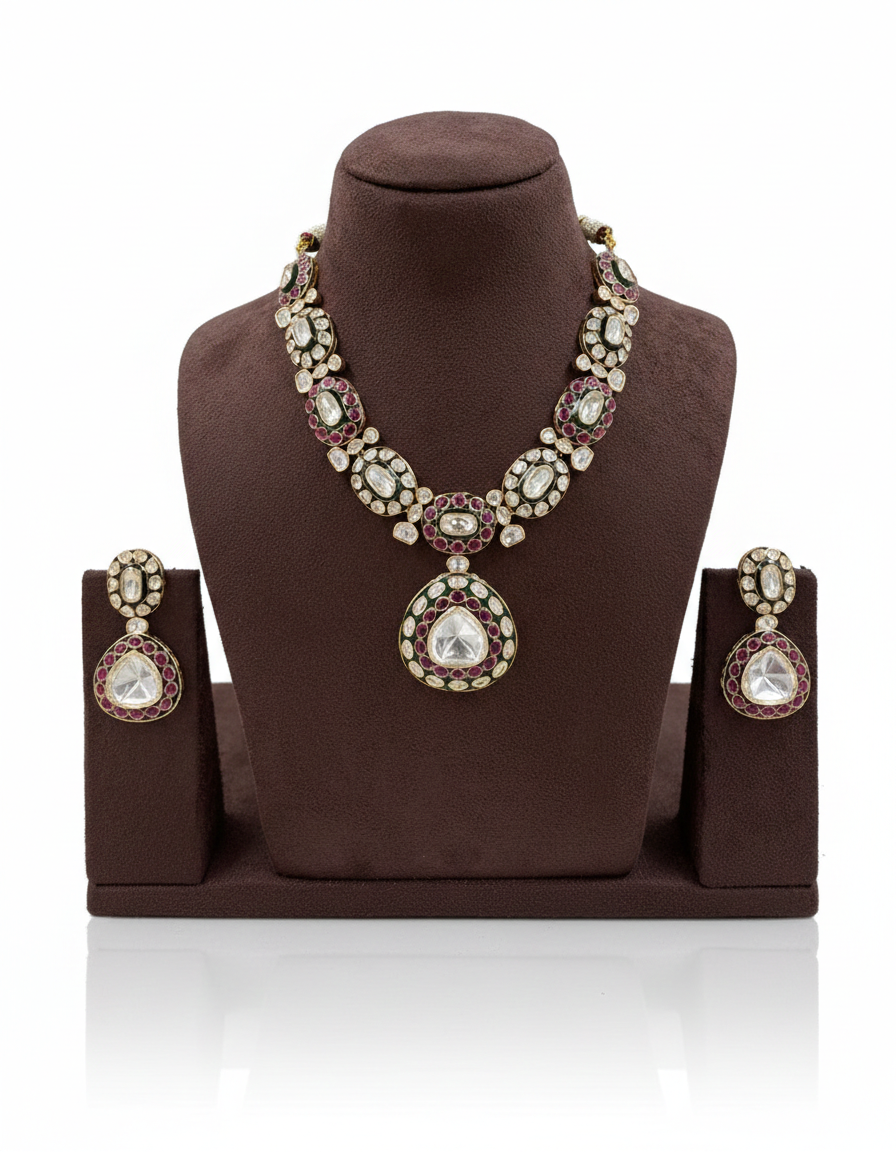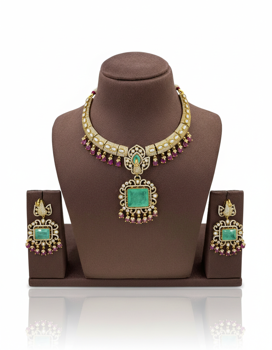 The set is completed with matching drop earrings, perfectly coordinated to mirror the pendant design. Ideal for weddings, festive occasions, and elegant evening wear, this versatile set pairs effortlessly with sarees, lehengas, and traditional ensembles.