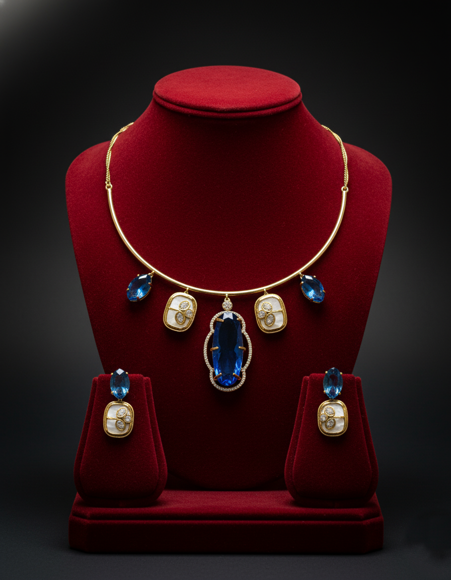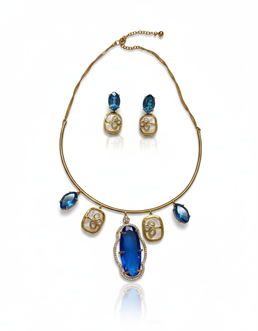 Step into a world of sculptural elegance with the Azure Horizon Set. Moving away from traditional filigree, this set embraces clean lines and bold color blocking. The necklace features a polished gold-finish torque bar that sits gracefully on the collarbone, suspending a series of captivating charms.