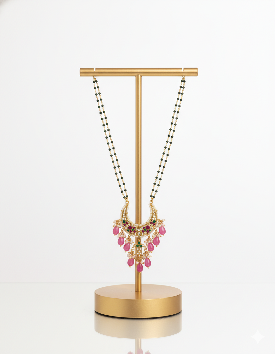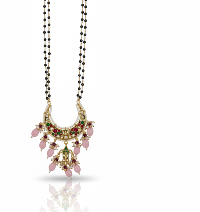 A stunning fusion of tradition and modern elegance, this necklace reimagines the classic Mangalsutra. Featuring symbolic black beads and a richly detailed pendant, it is a perfect statement piece for the modern woman who cherishes heritage.