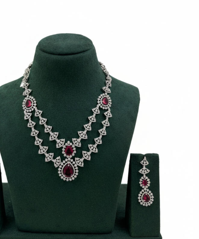 The Crimson Royale Layered Necklace & Earring Set is a breathtaking blend of regal charm and intricate craftsmanship. Featuring a graceful double-layered necklace design adorned with deep crimson teardrop stones, this set is enhanced by delicate geometric detailing that adds depth and brilliance. The centerpiece pendant and matching drop earrings are framed with shimmering accents, creating a luxurious and perfectly balanced look.