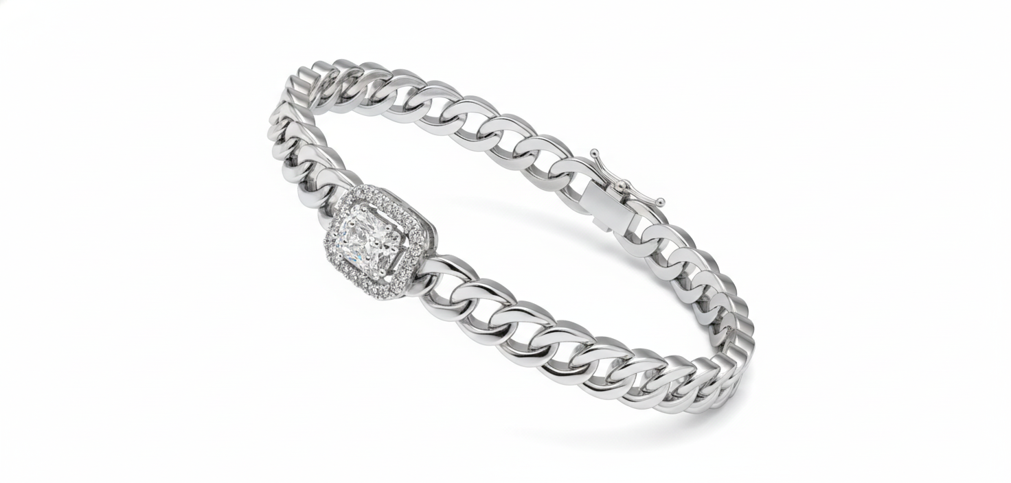 This statement bracelet redefines contemporary elegance by combining the industrial strength of the curb link with the delicate fire of fine jewelry. At its heart lies a radiant cushion-cut center stone, precisely set within a pave-accented halo to amplify its size and brilliance.