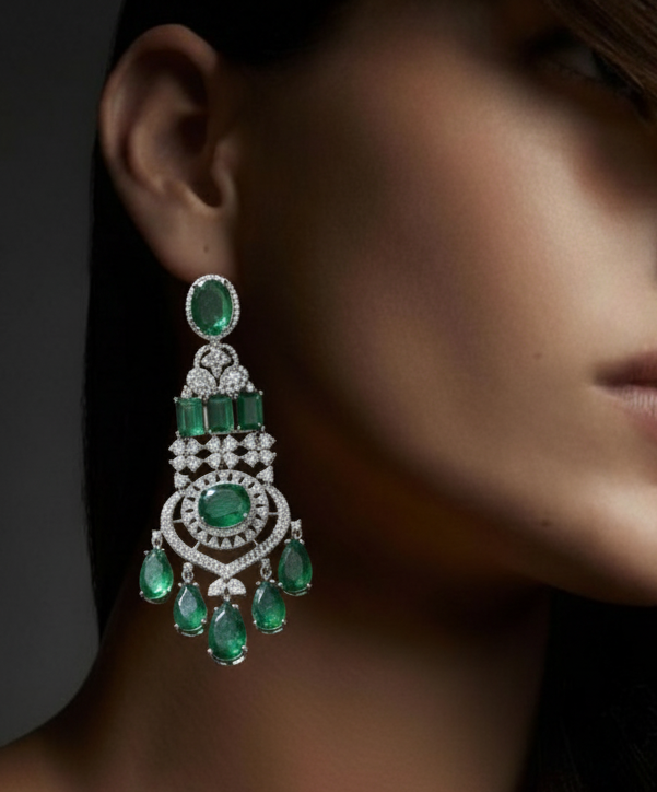 A breathtaking pair of grand chandelier earrings adorned with rich emerald gemstones and intricate diamond detailing. Featuring layered architectural motifs and elegant emerald drops, these earrings embody regal opulence and timeless craftsmanship—designed for gala evenings, weddings, and heirloom collections.
