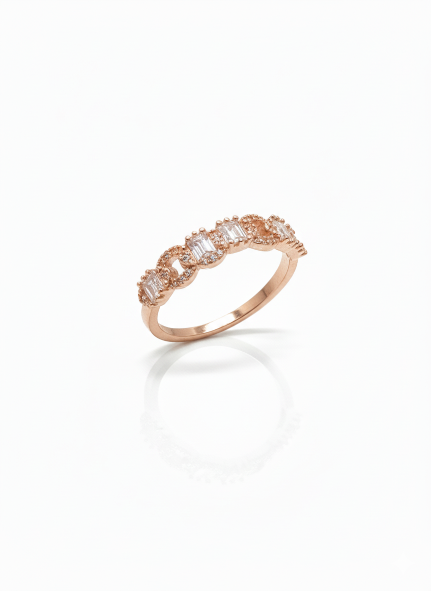 Graceful, refined, and timeless, this diamond infinity link band embodies elegance and symbolism. Crafted in a sleek white gold finish, the design features a series of delicate infinity-inspired links adorned with shimmering pavé-set diamonds. Emerald-cut diamond accents add structure and brilliance, creating a harmonious balance of sparkle and sophistication.
