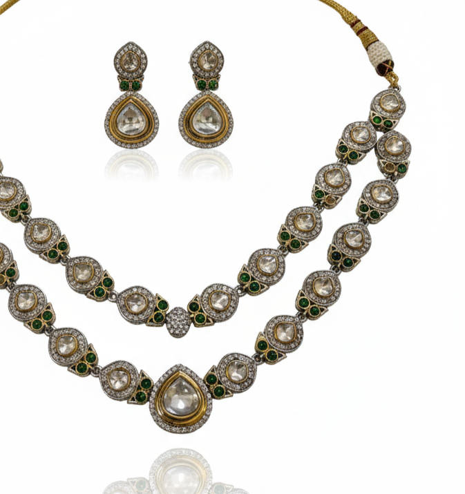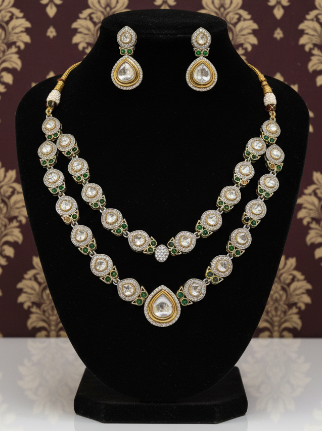Grandeur in two tiers. A breathtaking double-layered necklace set featuring traditional Kundan-inspired stones and emerald-green accents, finished with a majestic teardrop pendant and matching earrings.