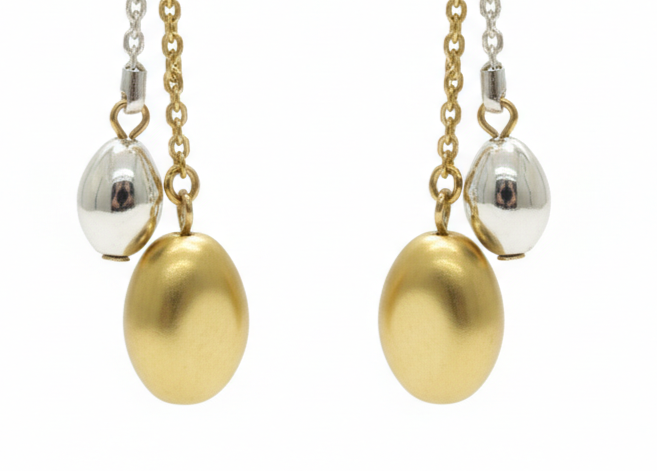 Mixed Textures: Each earring showcases a striking contrast between a large, satin-finished matte gold bead and a smaller, high-polish mirror silver bead.