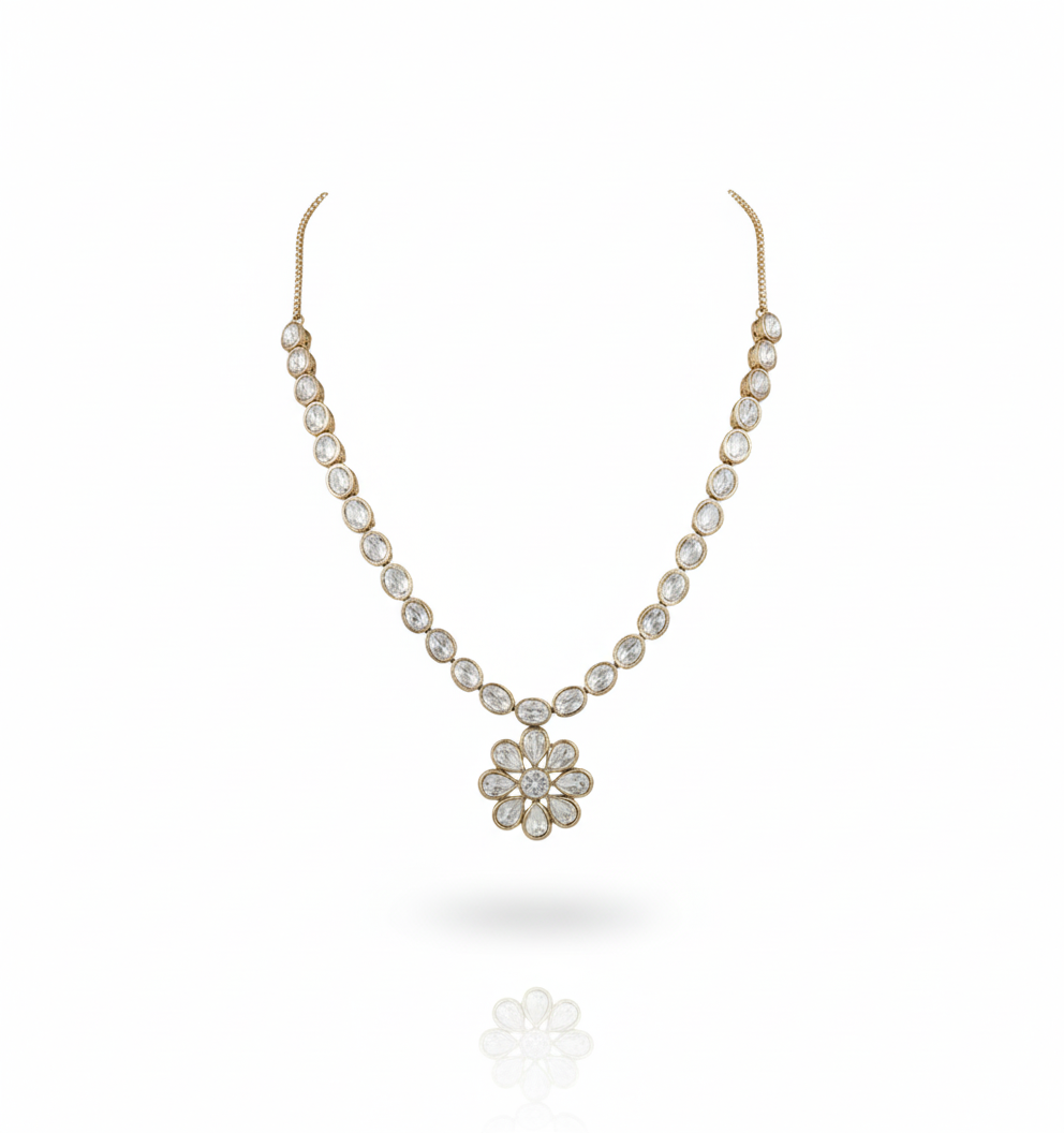 Add a touch of minimalist grace to your jewelry repertoire with this stunning floral-inspired set. The necklace features a delicate gold-toned strand composed of shimmering oval-cut stones, leading to a central pendant designed as a blooming flower. Each petal is meticulously set with pear-shaped Polki-style stones that radiate outward from a brilliant center, capturing a sense of organic beauty. Complemented by matching floral stud earrings, this ensemble offers a refined and lightweight look that effortlessly transitions from daytime elegance to evening charm.