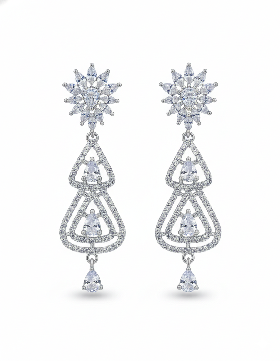 The layered chandelier silhouette creates depth and movement, while the final dangling teardrop stone adds a touch of dramatic sparkle. Finished in a polished silver-tone setting, these earrings are perfect for weddings, evening events, and special occasions where sophistication is essential.