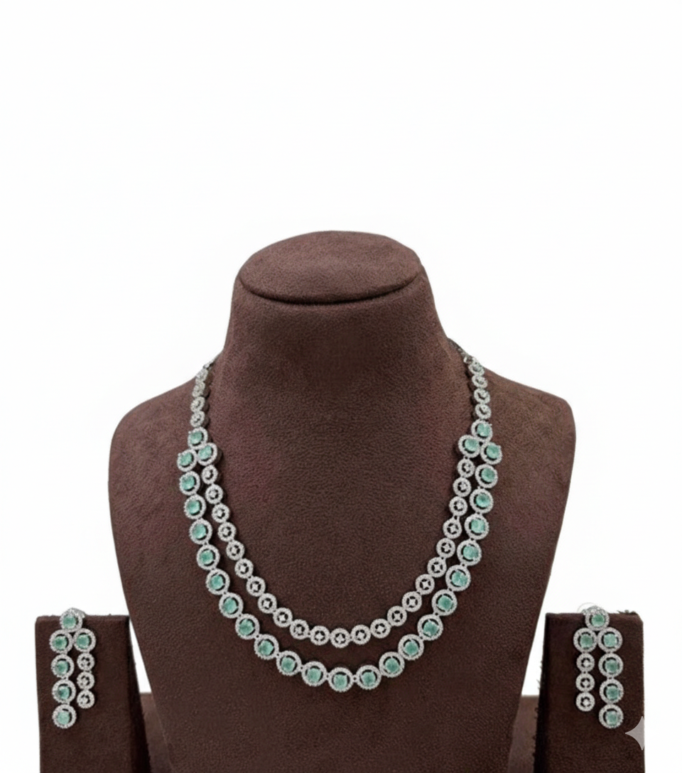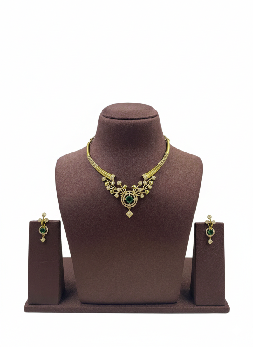 The Emerald Bloom Gold Necklace & Earring Set is inspired by nature’s elegance and timeless artistry. Featuring a beautifully sculpted gold-tone necklace with delicate floral motifs, the design is centered with a radiant emerald-green stone that adds a fresh, regal touch. The matching earrings mirror the floral detailing, creating a harmonious and refined ensemble.