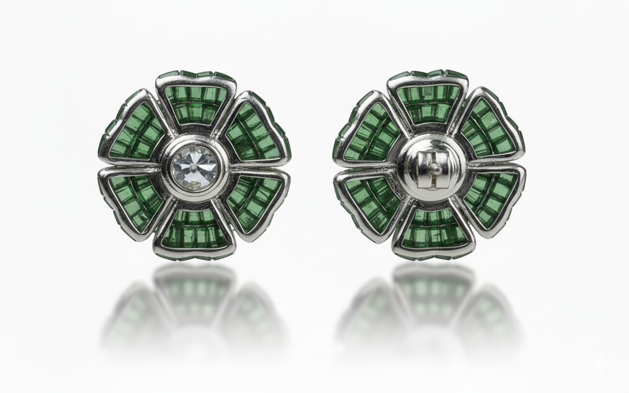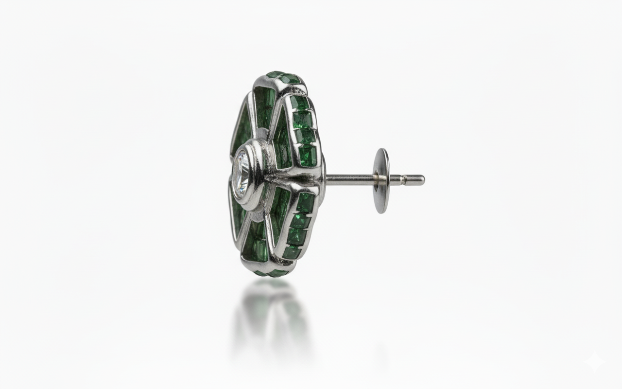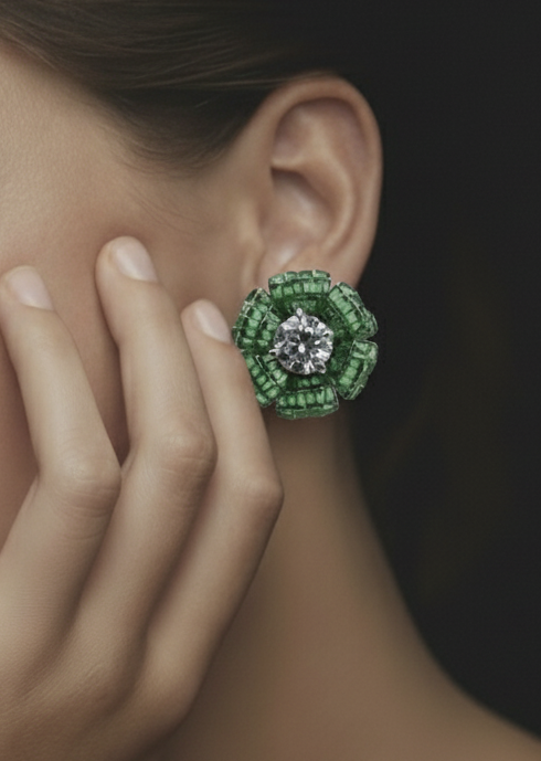 A masterclass in precision setting, our Emerald Butterfly Mosaic Earrings blend high-jewelry artistry with an enchanting, nature-inspired design. These statement studs are meticulously crafted to sit gracefully on the ear, reflecting light from every sculpted angle.