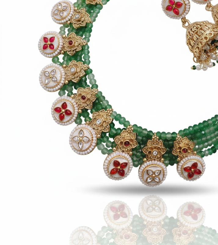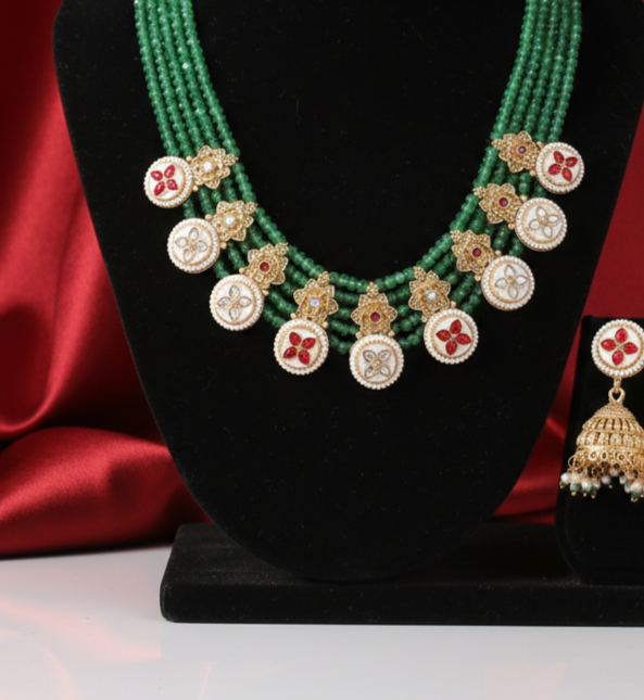 Add a vibrant touch of tradition to your jewelry collection with this Emerald Charm Festive Layered Necklace Set. Designed with multiple strands of rich green beads, this elegant piece is adorned with beautifully crafted gold-tone motifs and circular floral medallions featuring red and white stone accents.