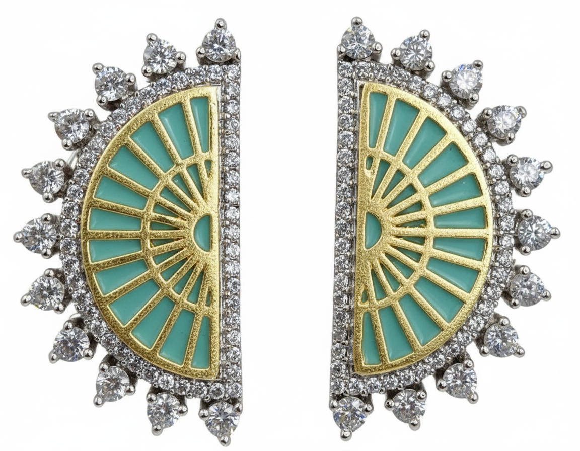 These striking artificial earrings feature a luxurious, modern design inspired by high-jewelry elegance. Crafted in a silver-tone finish, they showcase bold emerald-green rectangular stones set in a sleek vertical arrangement. Sparkling baguette and pear-shaped crystal accents cascade gracefully below, adding brilliance and movement. The structured yet fluid design makes these earrings perfect for evening parties, receptions, and statement occasions. Lightweight and comfortable despite their dramatic look, they pair beautifully with gowns, cocktail dresses, and contemporary fusion outfits, adding a touch of glamour and sophistication to any ensemble.